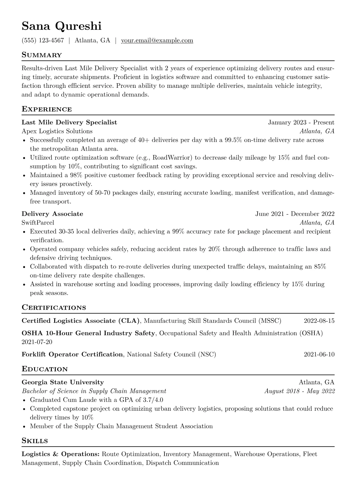 This template was built with JobSprout and can be remixed to create your own tailored Last Mile Delivery Specialist resume.