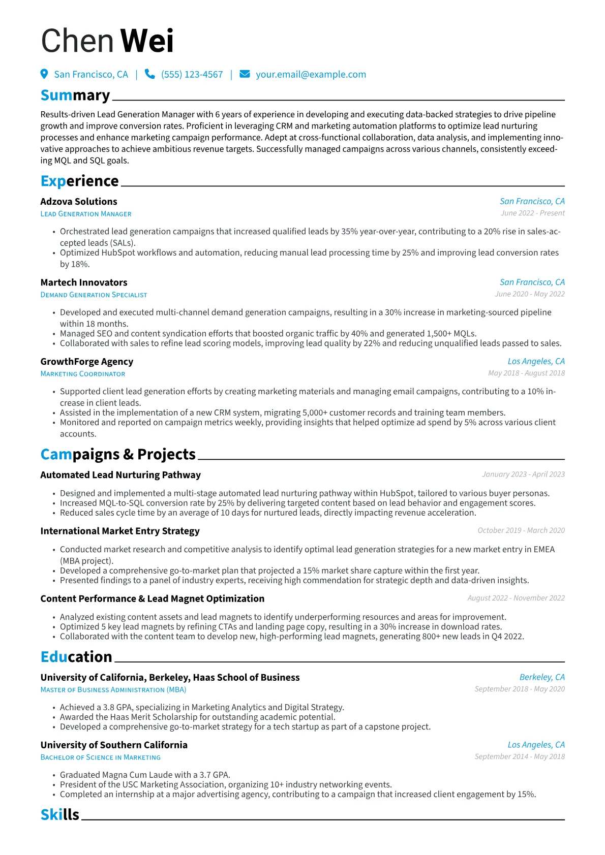 This template was built with JobSprout and can be remixed to create your own tailored Lead Generation Manager resume. It serves as an excellent starting point for crafting an impactful application.