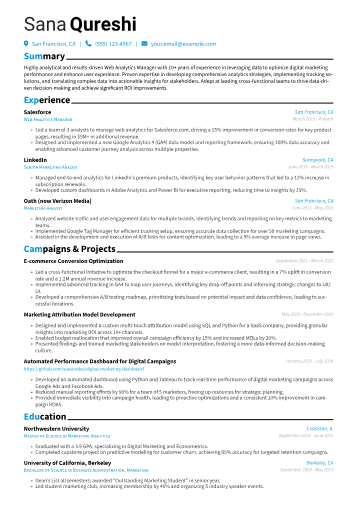 The JobSprout example effectively showcases these critical elements. Achievements are precisely quantified, detailing improvements like a 30% increase in MQLs or a 15% reduction in acquisition costs. Skills are thoughtfully grouped into categories such as "Marketing Automation," "CRM & Data Management," and "Analytics & Reporting," highlighting a broad technical and strategic toolkit. Specific tools such as HubSpot and Google Analytics are prominently listed, providing immediate insight into the candidate's operational capabilities.