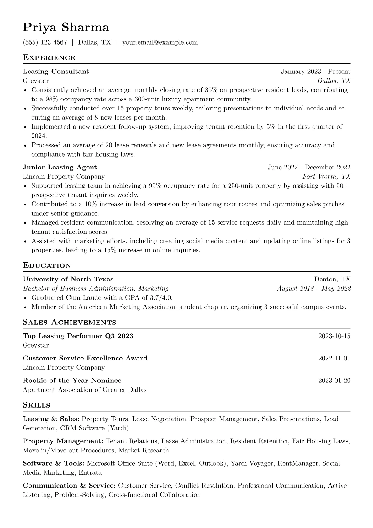 This JobSprout example effectively highlights these critical areas by integrating quantified achievements, such as "exceeded leasing targets by 15%," which powerfully illustrate sales capability. Its clear skills grouping separates client-facing abilities from administrative proficiencies, providing a quick overview of a candidate's diverse toolkit. Furthermore, relevant certifications or software proficiencies, if included, would further elevate its appeal to busy recruiters.