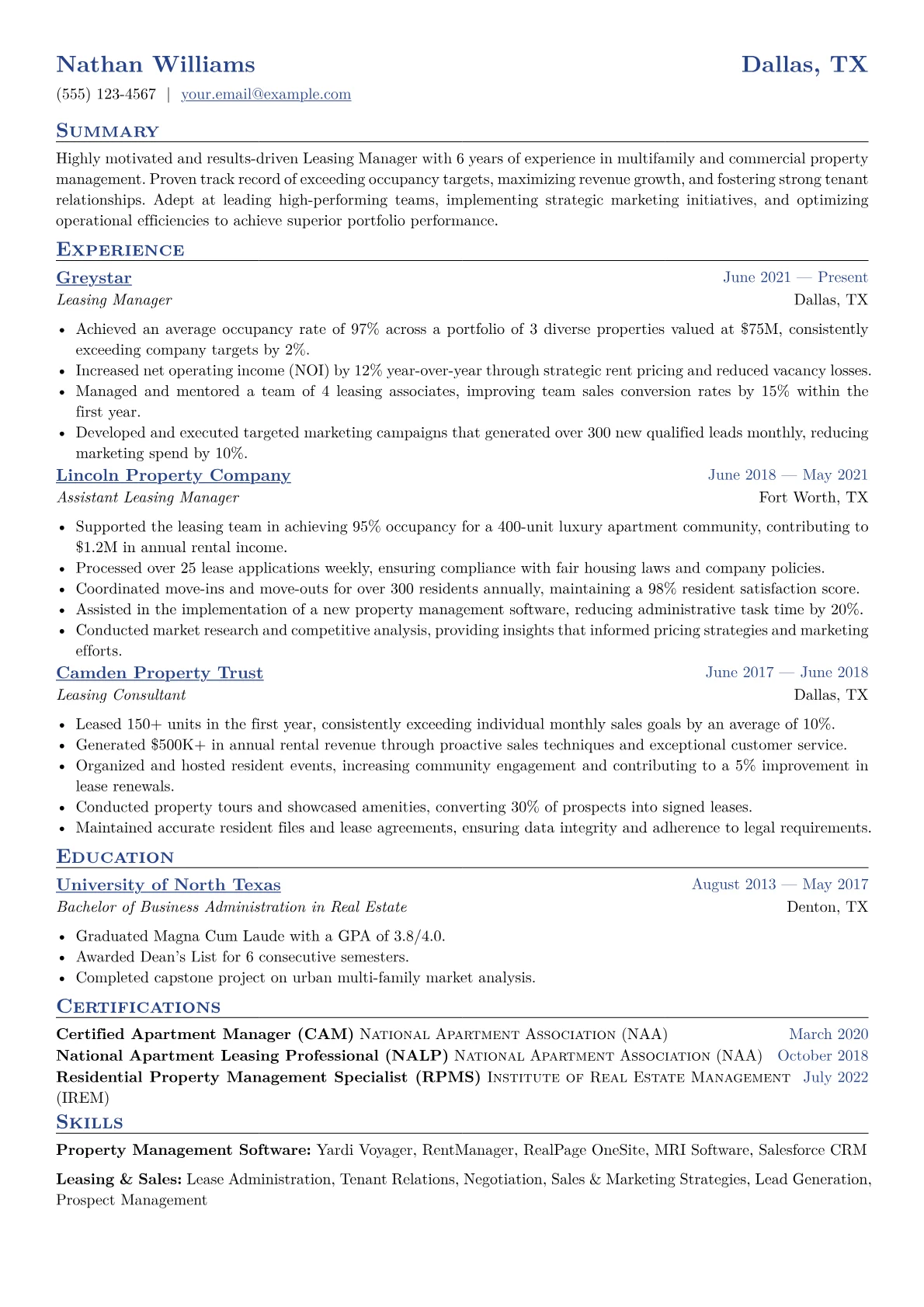 A strong Leasing Manager resume in Finance & Banking expertly highlights accomplishments in portfolio growth and financial compliance. Hiring managers specifically look for demonstrated ability to manage complex lease agreements, adhere to lease accounting standards like ASC 842, and contribute to tangible revenue generation or cost savings. Crucial achievements include quantifying portfolio value increases, reducing delinquency rates, or optimizing occupancy, alongside showcasing expertise in due diligence processes and capital expenditure analysis. Relevant certifications such as a CPM or real estate license, coupled with familiarity with industry-specific terminology like CAM charges and NPV analysis, are highly valued.
