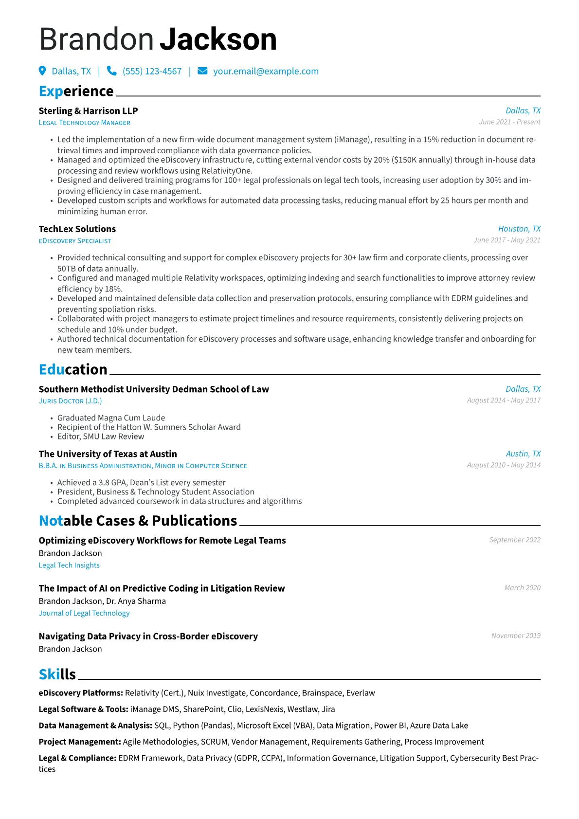 This example resume excels by showcasing quantified achievements, such as "Streamlined eDiscovery processes, reducing project turnaround time by 15%." It prominently highlights relevant certifications like Relativity Certified User, signaling immediate competency to legal firms. Furthermore, the strategic grouping of technical and legal-specific skills allows recruiters to quickly identify expertise in areas like document management systems, cybersecurity, and litigation support.