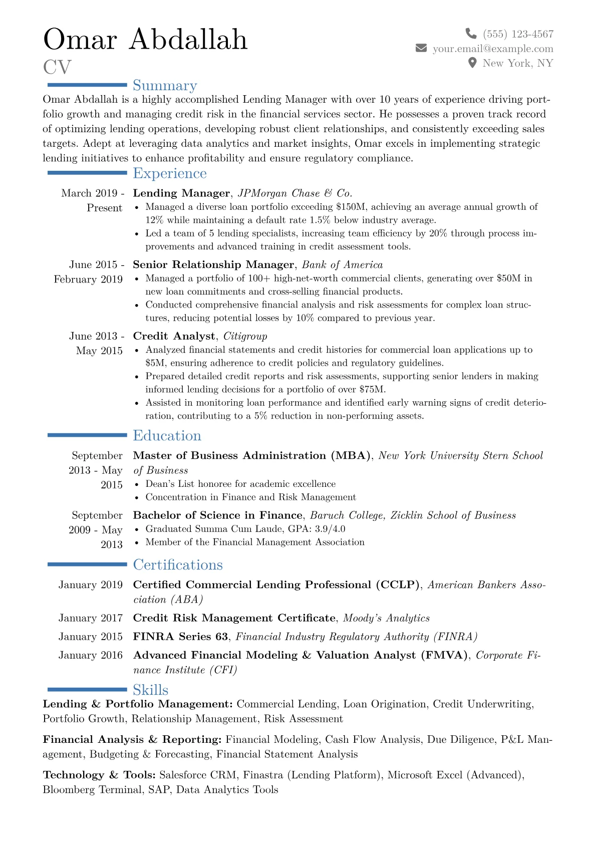 For a senior Lending Manager in Finance & Banking, hiring managers seek precise demonstrations of credit acumen and portfolio stewardship. A compelling resume emphasizes quantifiable achievements in risk assessment, loan origination, and regulatory adherence. Professionals should showcase successes such as growing loan portfolios, reducing delinquency rates, or streamlining underwriting workflows. Explicitly mentioning relevant financial modeling expertise, compliance frameworks like BSA/AML, and certifications such as CFA or FRM signals specialized industry knowledge and dedication.