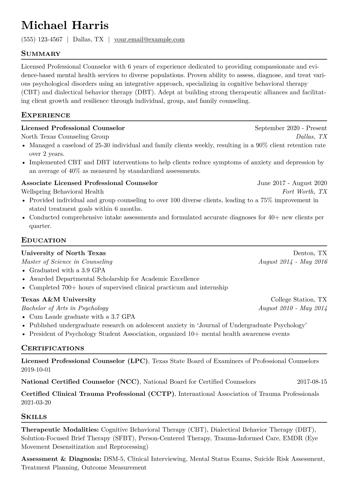 This template was built with JobSprout and can be remixed to create your own tailored Licensed Professional Counselor resume.