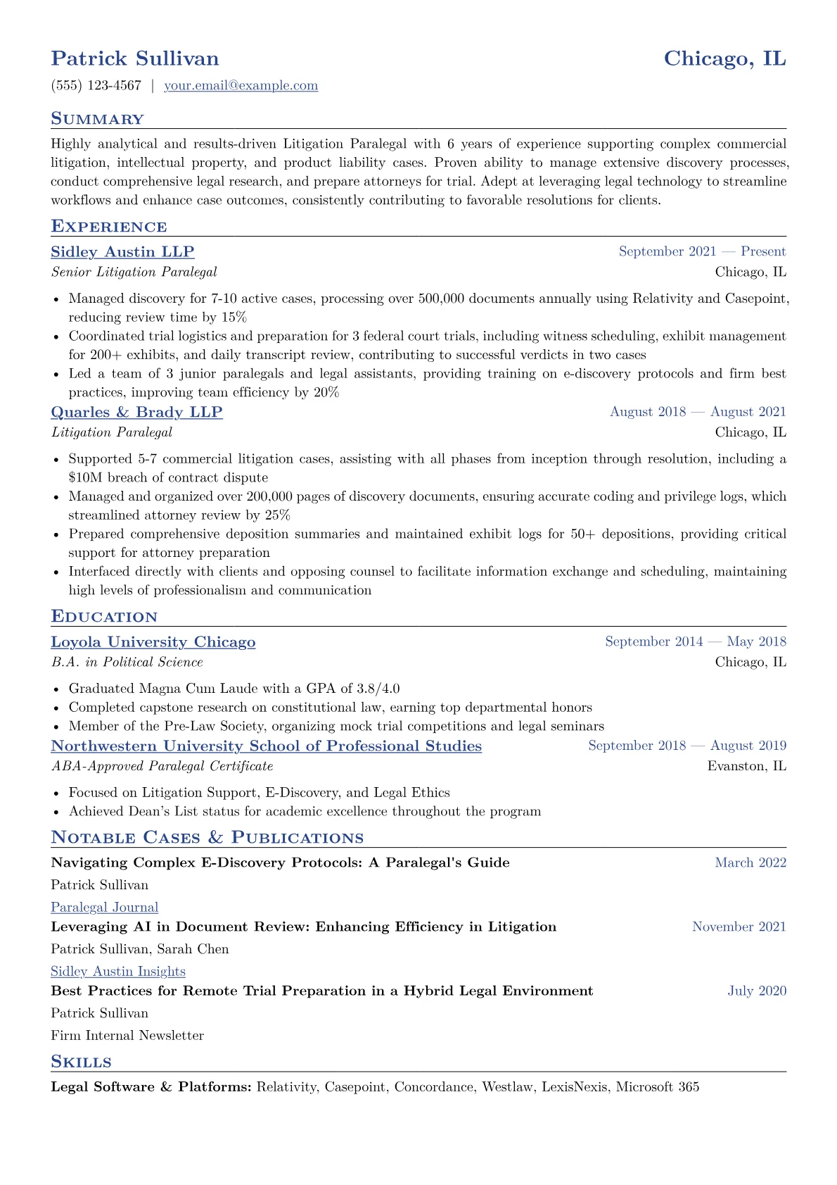 For a mid-level Litigation Paralegal, hiring managers specifically seek evidence of robust e-discovery management, precise trial preparation, and mastery of legal research platforms. Strong resumes detail concrete achievements like efficiently handling document review projects, drafting deposition summaries, and supporting complex motion practice. Essential terminology includes Relativity, Concordance, Summation, and Westlaw or LexisNexis proficiency. Candidates must demonstrate an understanding of federal and state court rules, the ability to manage multiple litigation dockets simultaneously, and often hold certifications such as NALA or NFPA.