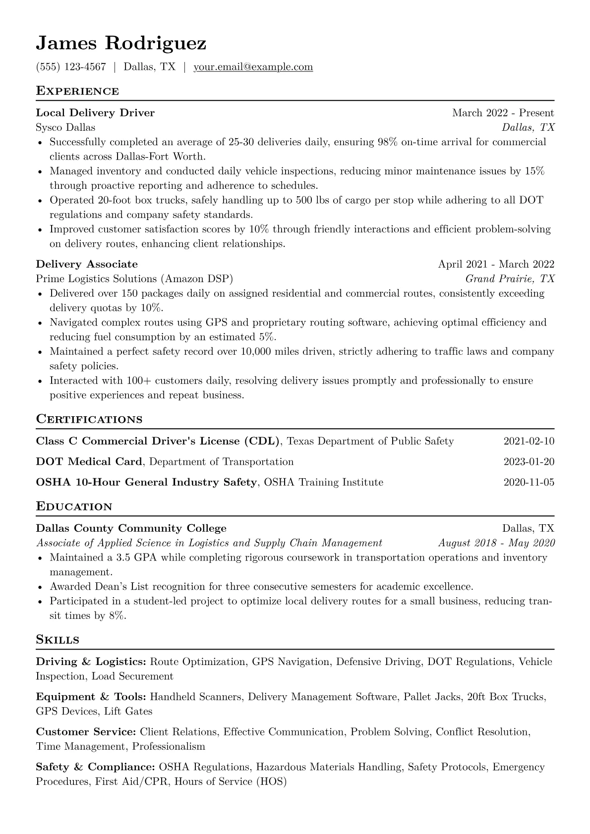 This JobSprout resume example effectively highlights these critical aspects. It showcases specific achievements with quantifiable metrics, such as package delivery volume or on-time rates, and groups essential skills like navigation, vehicle maintenance, and customer service. Structuring relevant experience clearly makes it easy for recruiters to quickly identify a candidate’s capabilities.