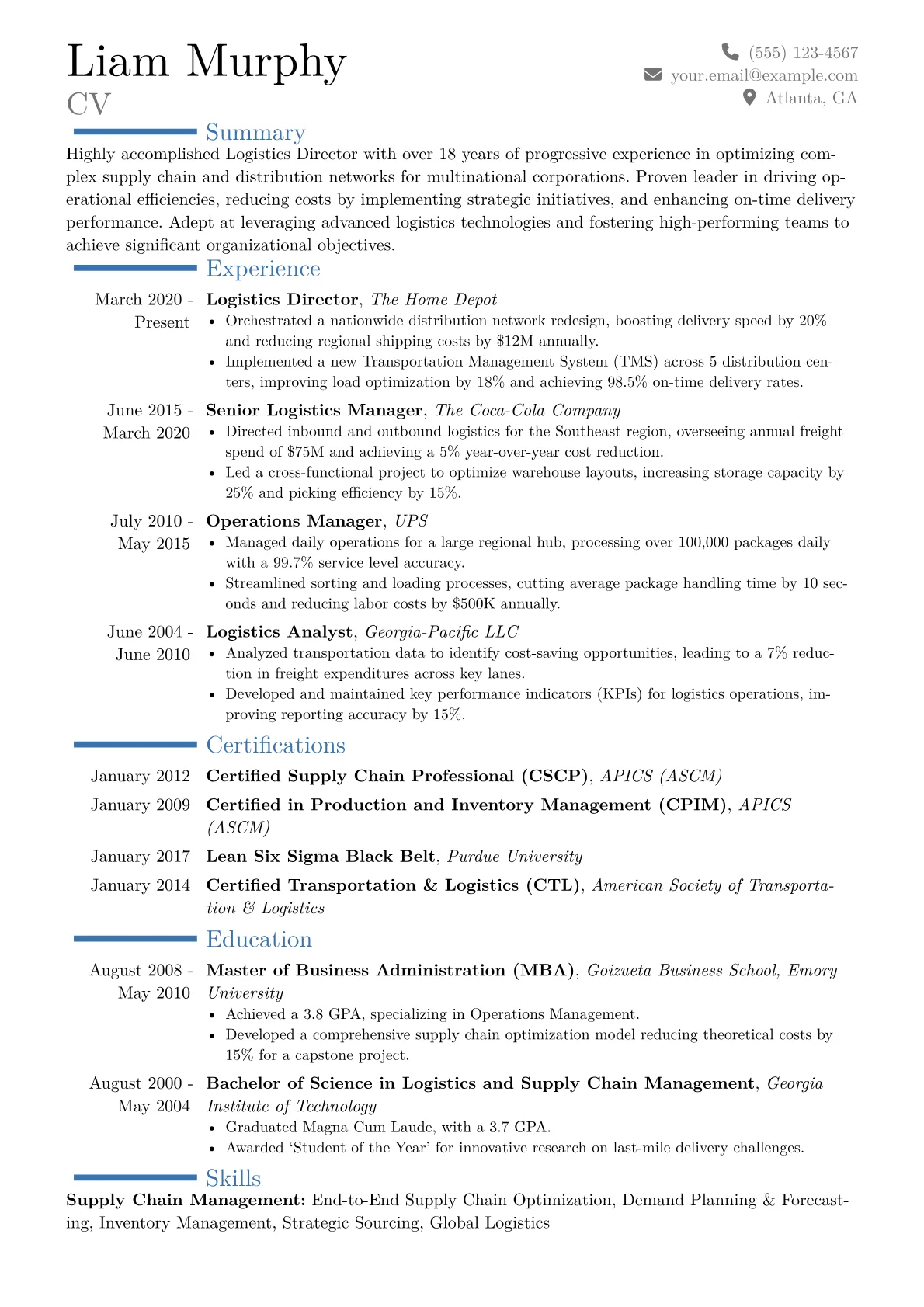 This example CV excels by featuring quantified accomplishments prominently, demonstrating a direct impact on business outcomes. It strategically groups technical proficiencies, highlighting specific WMS/TMS systems used, data analytics tools, and regulatory knowledge. The template effectively showcases leadership in vendor negotiations, risk mitigation, and continuous process improvement, all essential competencies for a senior Logistics Director. Key certifications are clearly listed, instantly communicating a candidate’s specialized qualifications to recruiters.