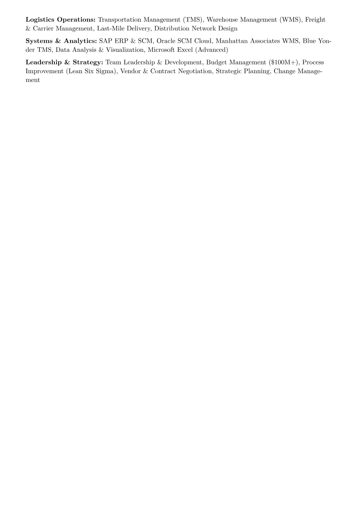 For a Logistics Director with 15+ years of experience across diverse "Other" industries, hiring managers seek clear evidence of strategic leadership in optimizing intricate supply chains. They look for concrete achievements such as reducing operational expenditures by specific percentages, improving on-time delivery metrics, or successfully implementing large-scale logistics technology integrations. Expertise in global freight management, lean logistics principles, and proficiency with advanced WMS/TMS platforms are crucial. Certifications like CSCP or CLTD further validate a candidate’s expertise and commitment to industry best practices.