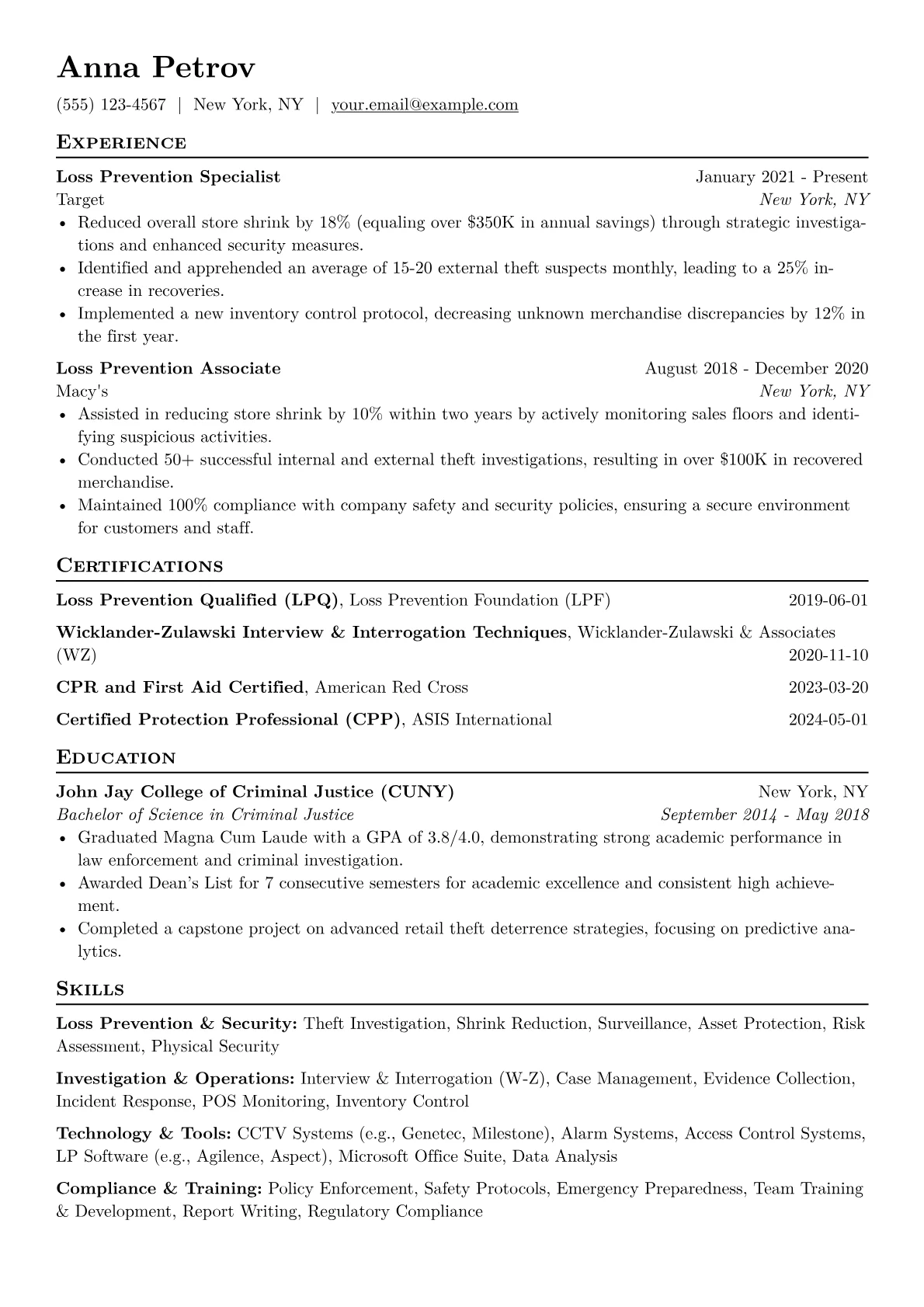 Hiring managers in Retail and E-commerce seek Loss Prevention Specialists who can clearly demonstrate tangible impact on reducing shrink and enhancing security. A strong resume highlights a proactive approach to risk management, proficiency in surveillance technology, and a solid understanding of retail operations and policy enforcement. The unique challenge lies in quantifying preventative actions and showcasing a blend of investigative acumen with customer service skills.