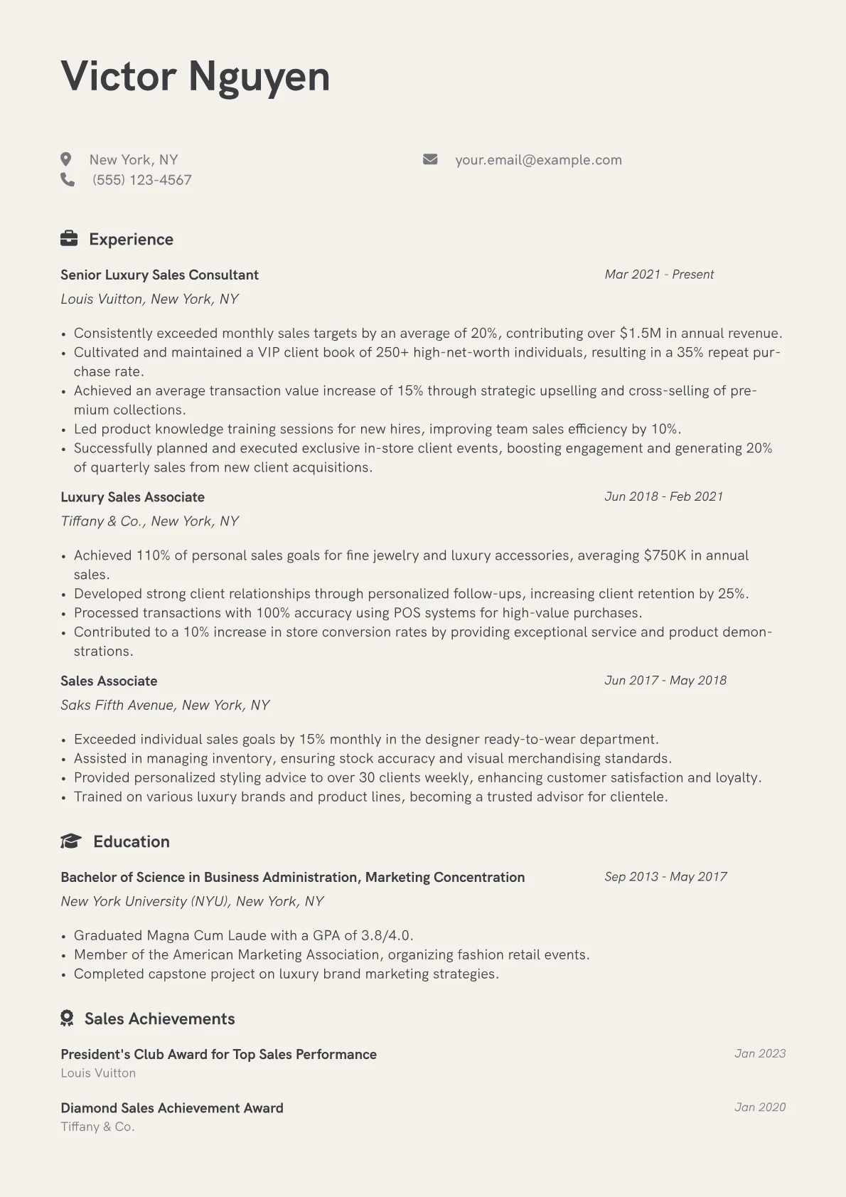 A compelling Luxury Sales Consultant resume must showcase a proven ability to drive high-value sales, cultivate lasting client relationships, and embody brand prestige. Hiring managers in Retail & E-commerce seek candidates who can exceed ambitious targets while delivering an exceptional, personalized customer experience. The unique challenge is balancing aggressive salesmanship with sophisticated clienteling and deep product knowledge.