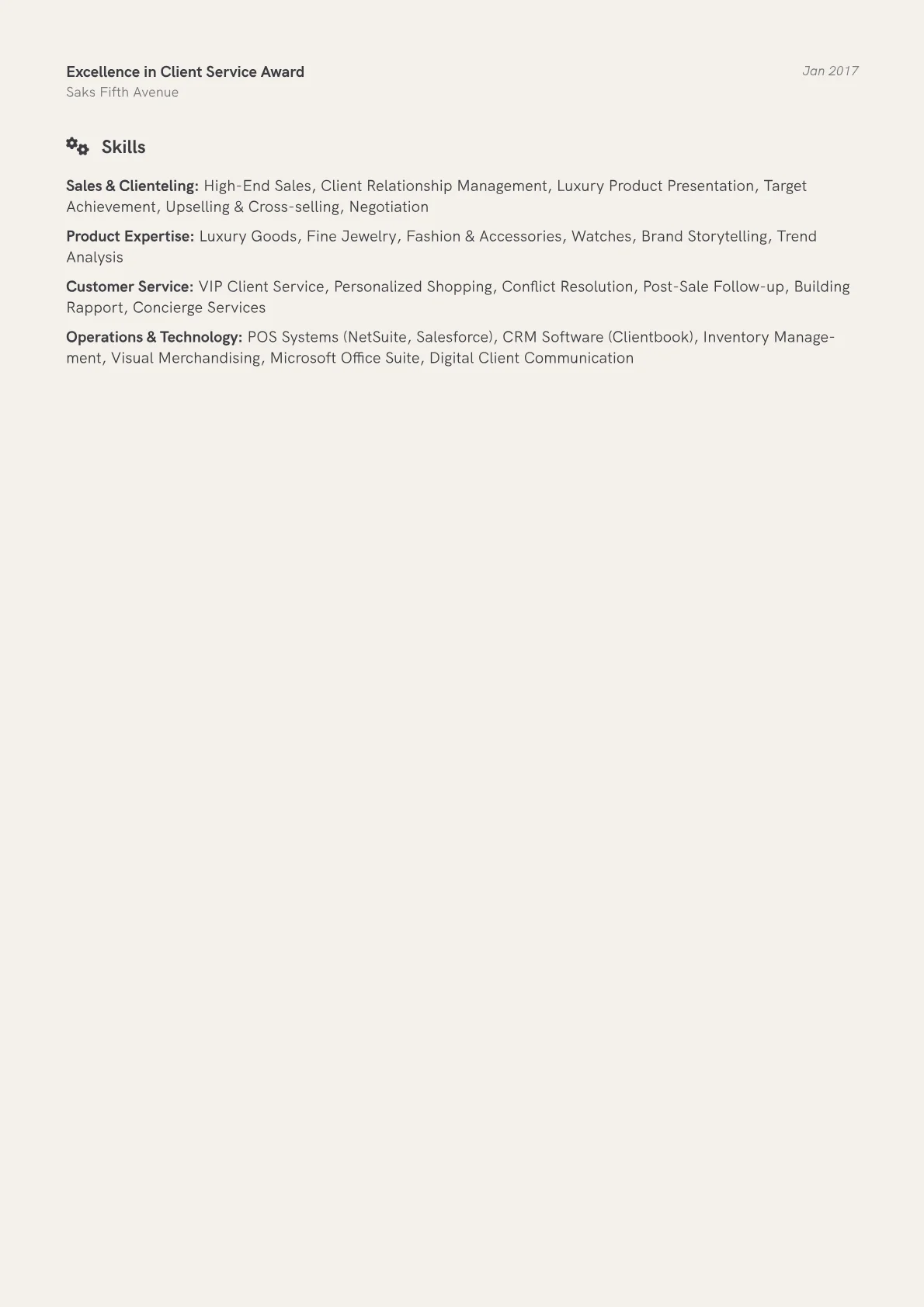 This JobSprout example excels at highlighting these crucial elements. It effectively uses quantified achievements to demonstrate significant revenue generation and client retention, while a dedicated skills section clearly outlines expertise in luxury market trends and bespoke clienteling. Relevant certifications further reinforce professional development and commitment to the industry.