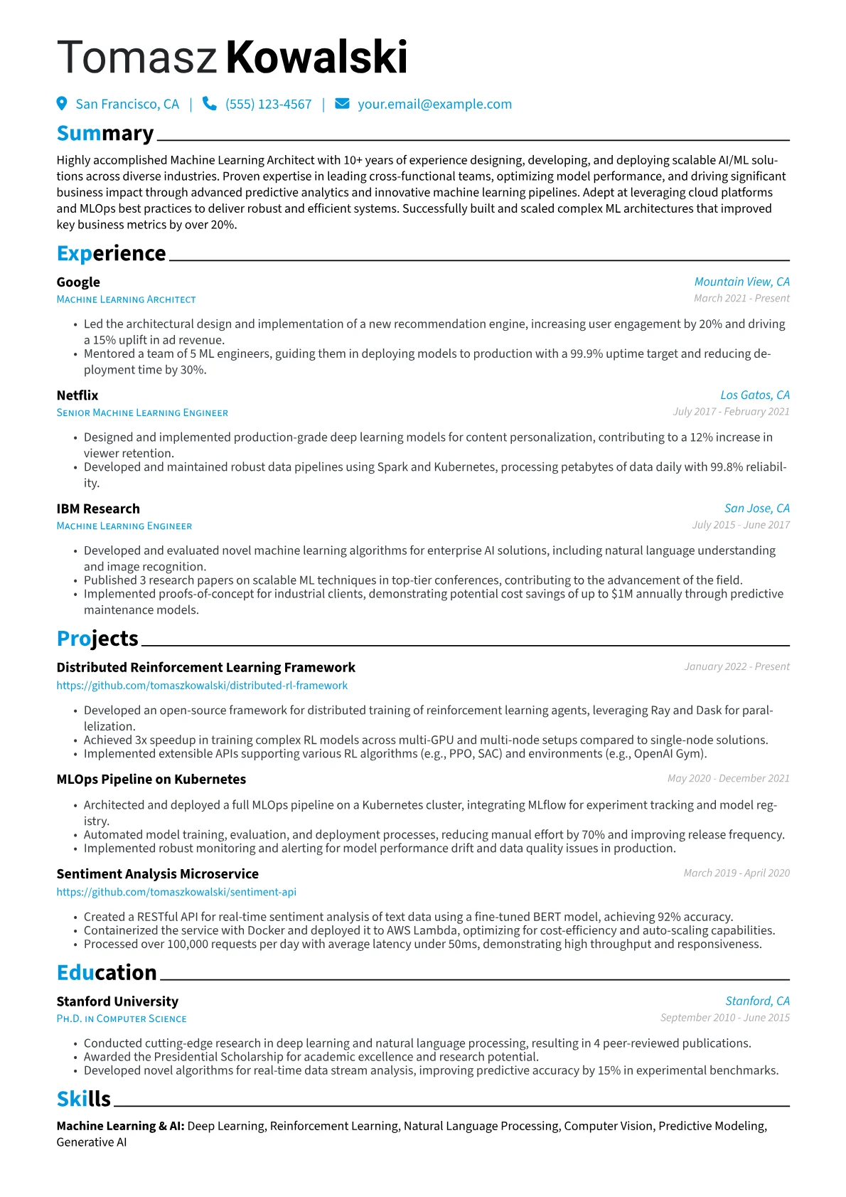 This example CV excels at presenting these critical qualifications. It effectively quantifies achievements by detailing improvements like reducing inference costs by 30% or increasing model deployment frequency by 2x, providing clear business impact. Skills are intelligently grouped, distinguishing core ML frameworks from cloud platforms and MLOps tools, which clearly articulates the architect's technical breadth and depth. Furthermore, certifications like the AWS Certified Machine Learning Specialty are prominently highlighted, alongside a robust command of tools such as Kubeflow, MLflow, Docker, and Kubernetes.