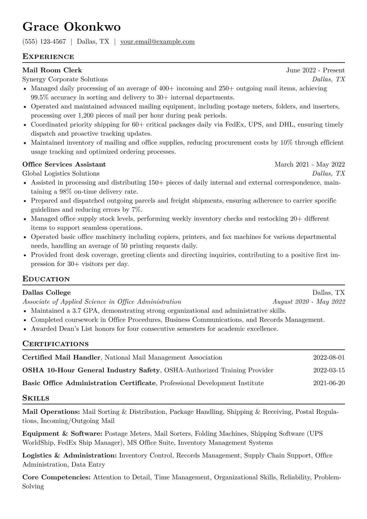 This example excels by clearly categorizing essential skills like mail sorting, package handling, and inventory management, making key competencies immediately visible. Its inclusion of quantifiable achievements, such as "processed X daily packages" or "reduced Y errors," effectively demonstrates impact and efficiency even for entry-level experience. This strategic presentation helps applicants stand out in a competitive field.