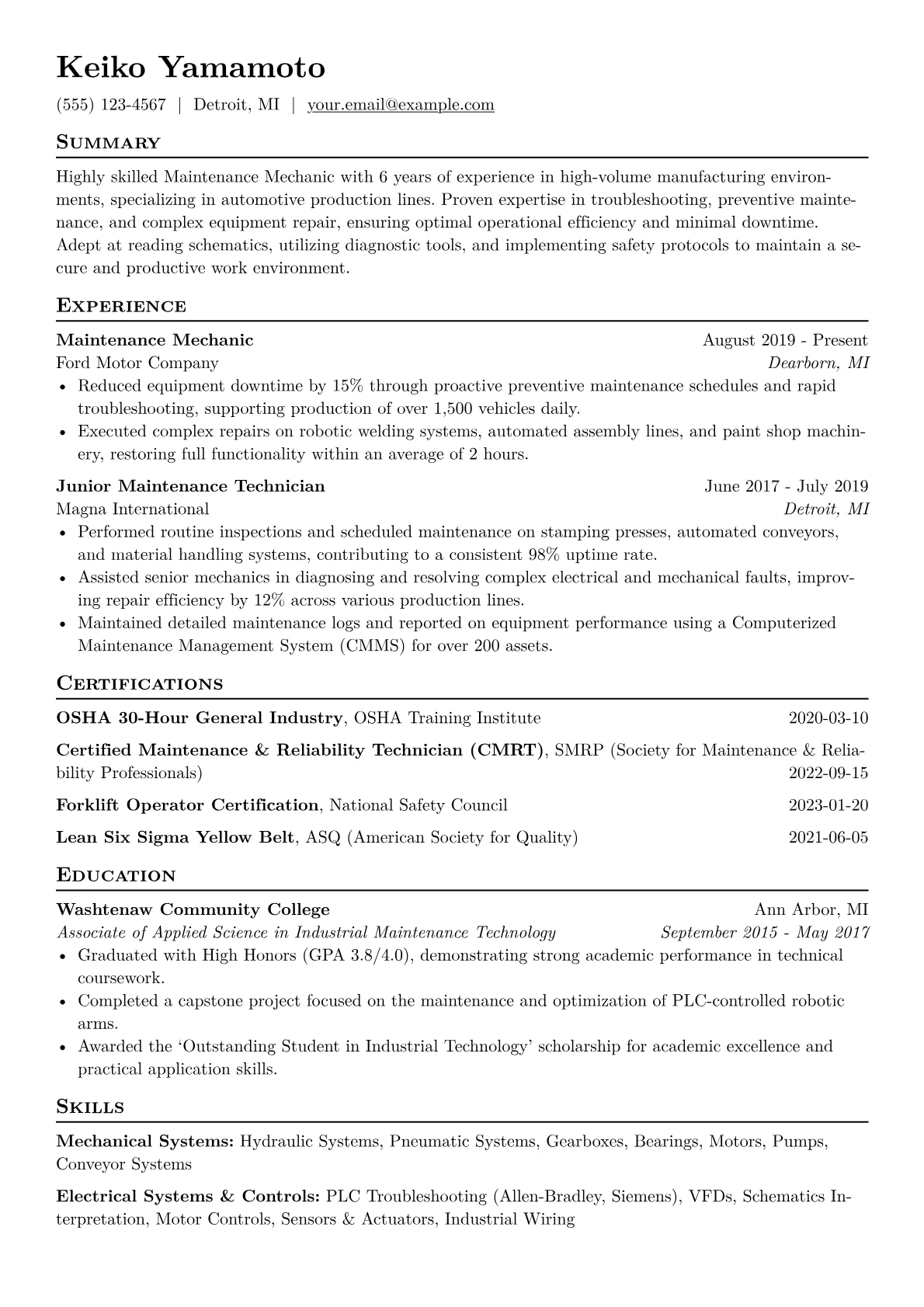 This robust template was built with JobSprout and can be remixed to create your own tailored Maintenance Mechanic resume, ensuring your qualifications stand out effectively.