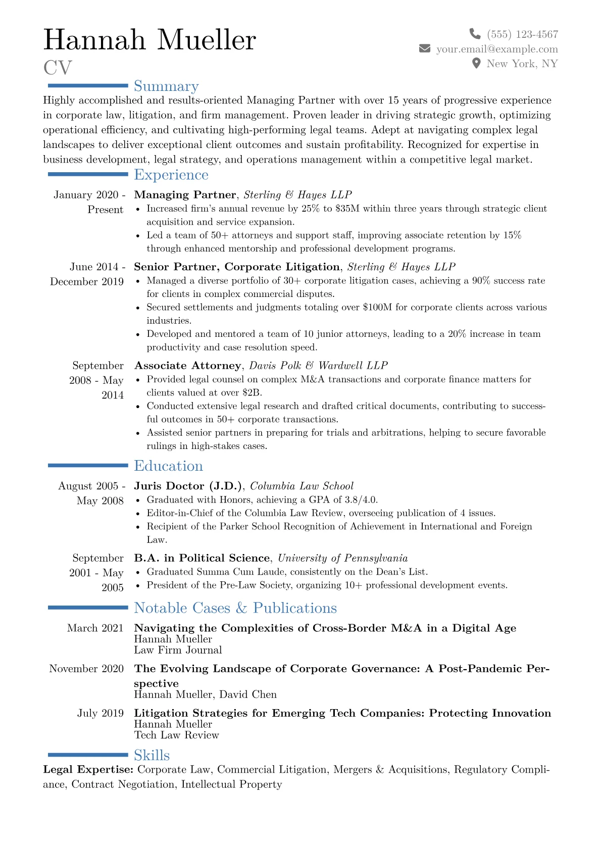 Crafting an influential Managing Partner Law Firm resume requires showcasing strategic leadership and tangible impact within the legal landscape. Hiring committees seek demonstrable success in firm expansion, P&L management, and cultivating robust legal teams. Key achievements should highlight significant revenue growth, successful client acquisition strategies, and innovations in practice management or legal technology integration. Specific bar admissions, leadership in prominent legal associations, and advanced legal certifications are crucial differentiators for executives at this level. The focus remains on leadership that delivers both legal excellence and commercial prosperity.