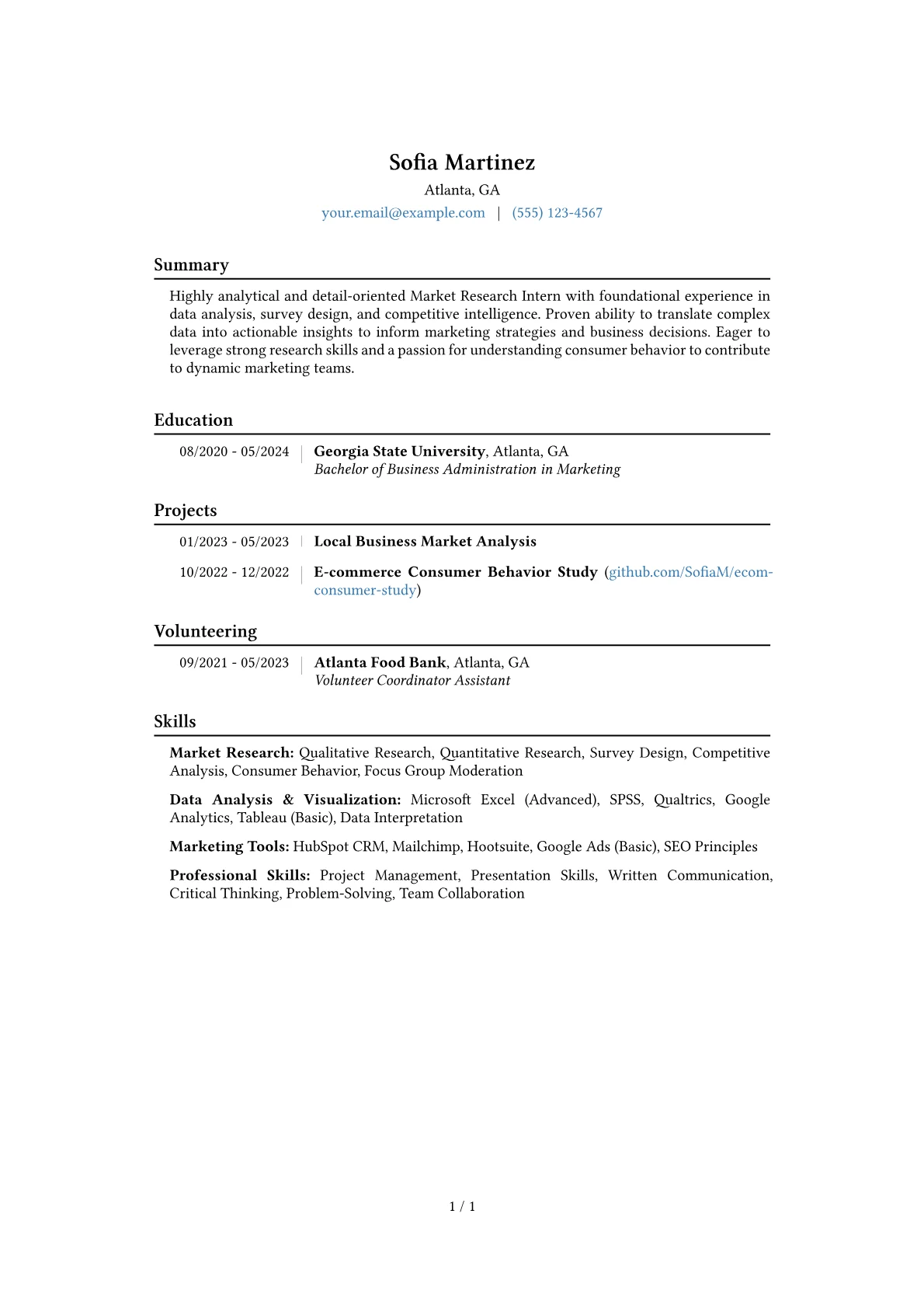 This template was built using JobSprout and can be remixed to create your own tailored Market Research Intern resume. It provides a solid framework for highlighting your unique qualifications.