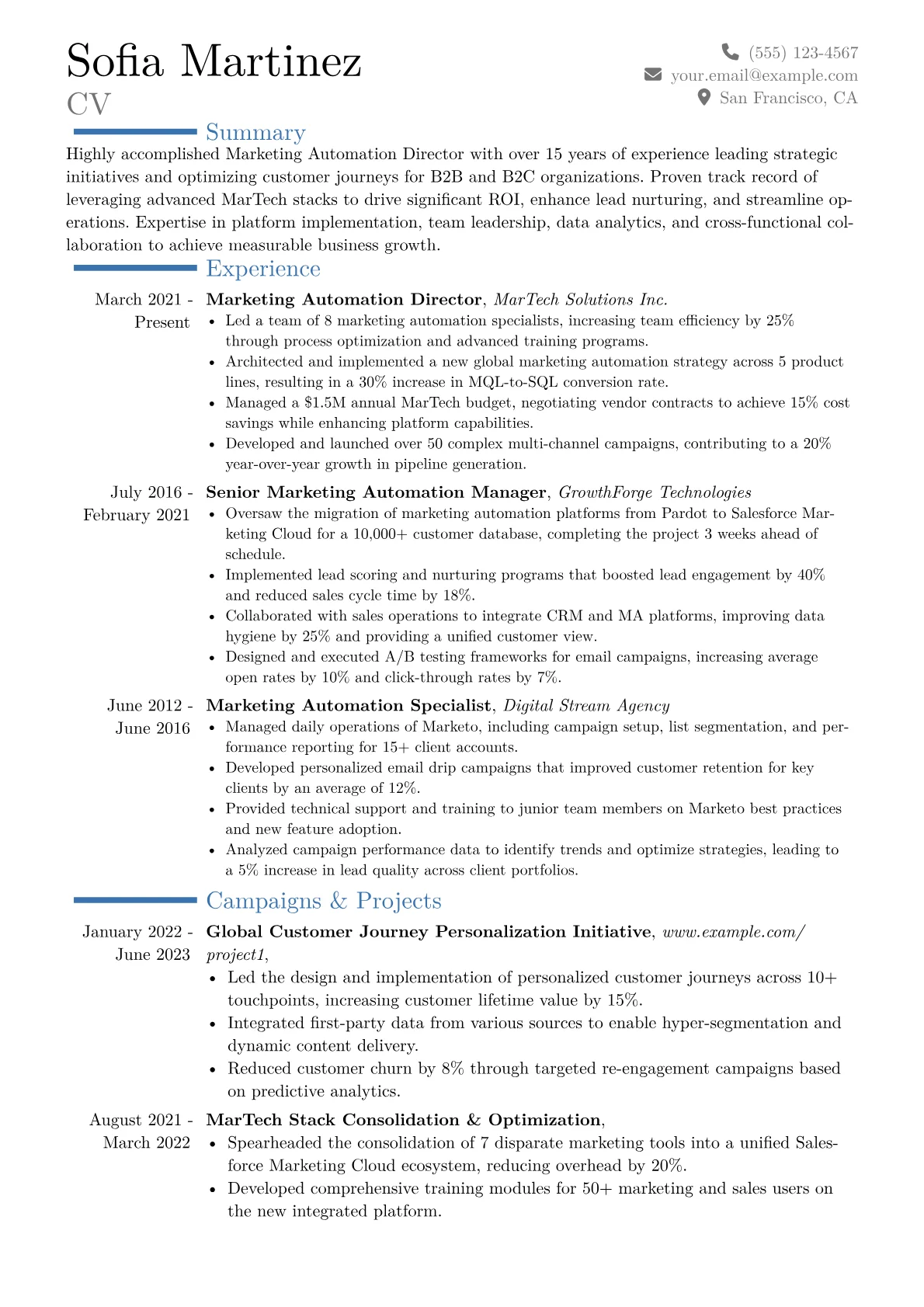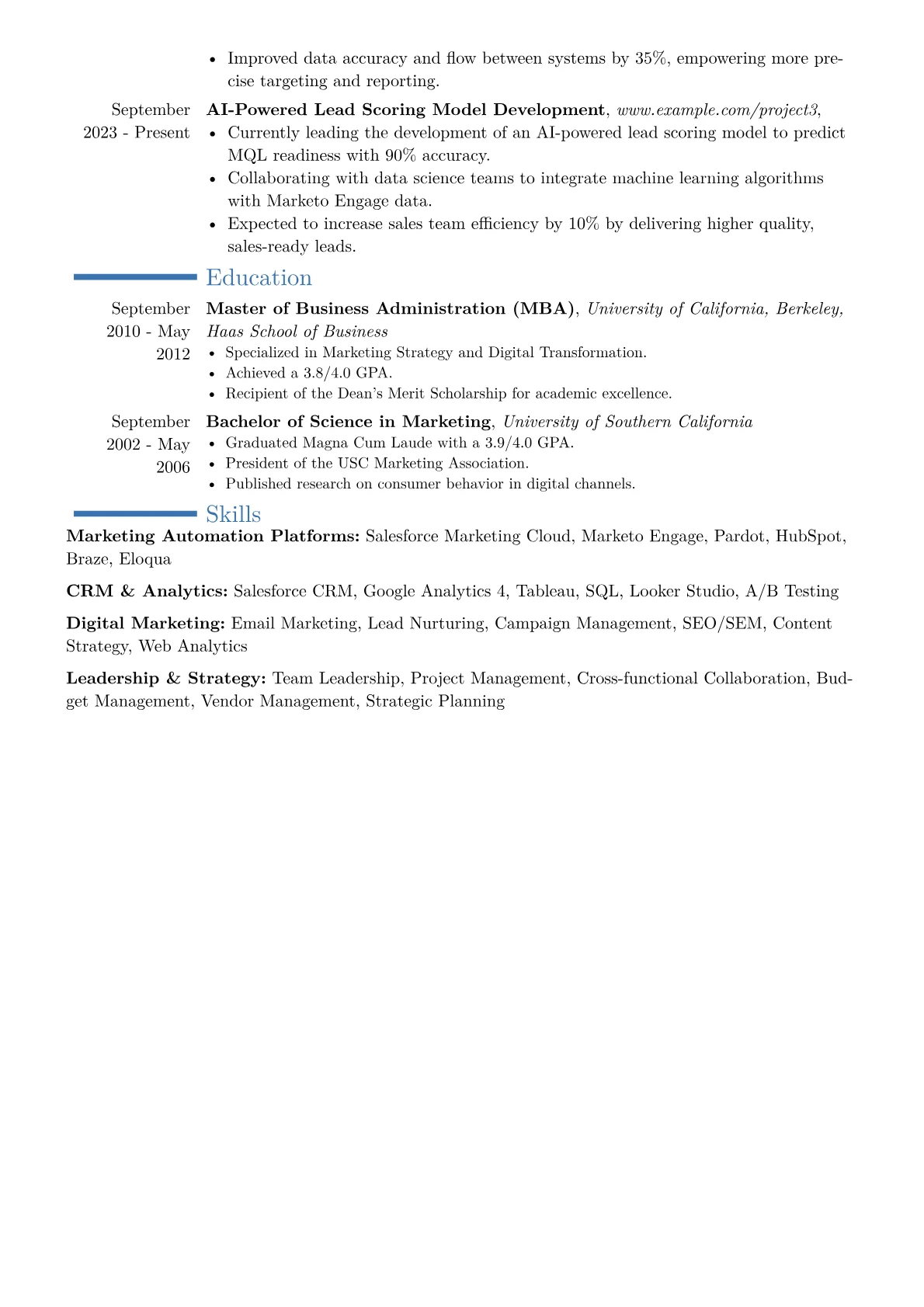 This example CV excels by clearly quantifying achievements, providing concrete examples like "Increased MQL-to-SQL conversion by 25% through optimized lead scoring models" or "Reduced customer acquisition cost by 18% via targeted re-engagement campaigns." Skills are thoughtfully categorized, separating platform expertise (e.g., Pardot, Braze, Iterable), strategic capabilities (e.g., customer journey mapping, ABM strategy), and analytical tools (e.g., Tableau, Google Analytics). The resume explicitly highlights certifications and the specific MarTech tools managed, giving a precise overview of the candidate's capabilities.