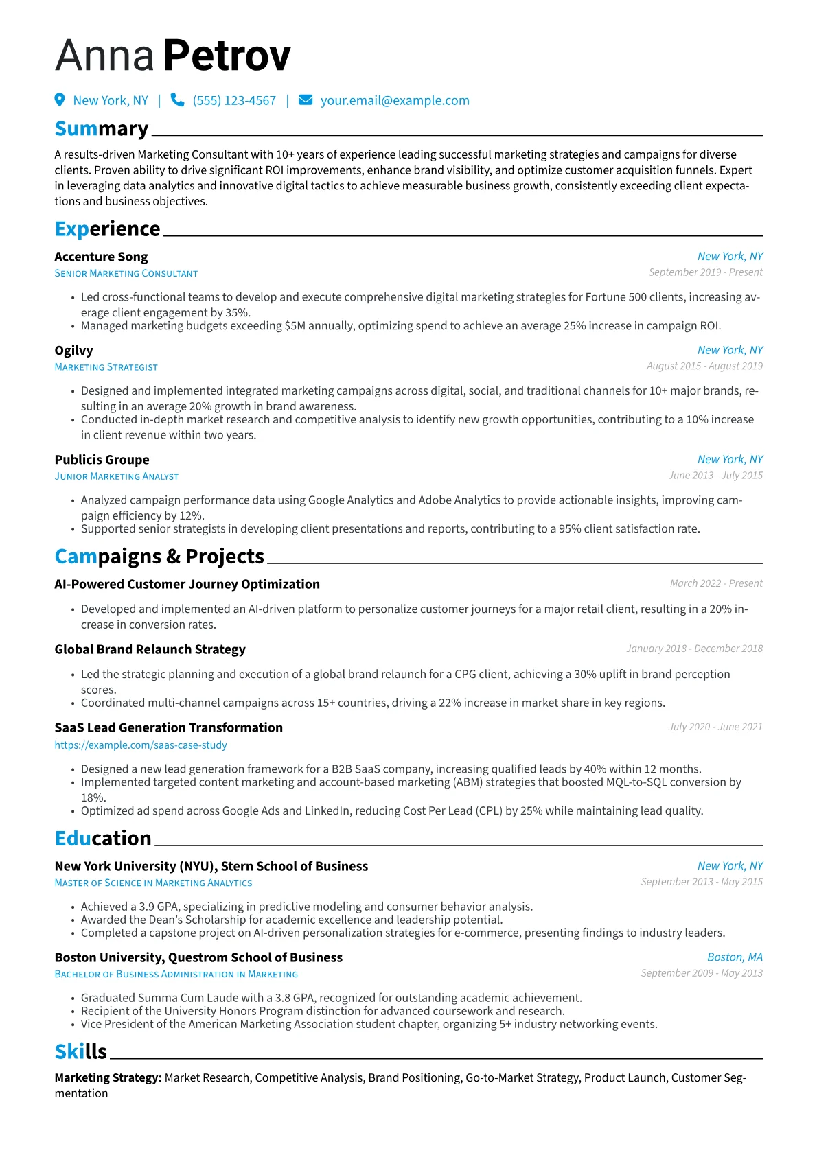 This template was built with JobSprout and can be remixed to create your own tailored Marketing Consultant resume.