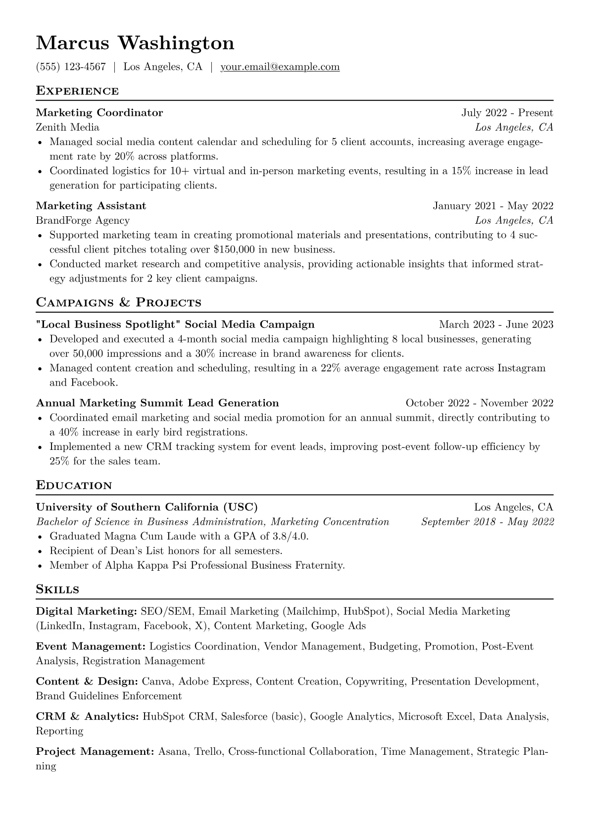 Hiring managers for entry-level Marketing Coordinator roles seek candidates who can demonstrate foundational marketing skills and a genuine enthusiasm for the dynamic advertising industry. A strong resume highlights hands-on experience with social media, content creation, or basic analytics, often from internships or volunteer work, and uses relevant keywords to pass ATS scans. The challenge is often showcasing potential and learning agility without extensive professional experience.