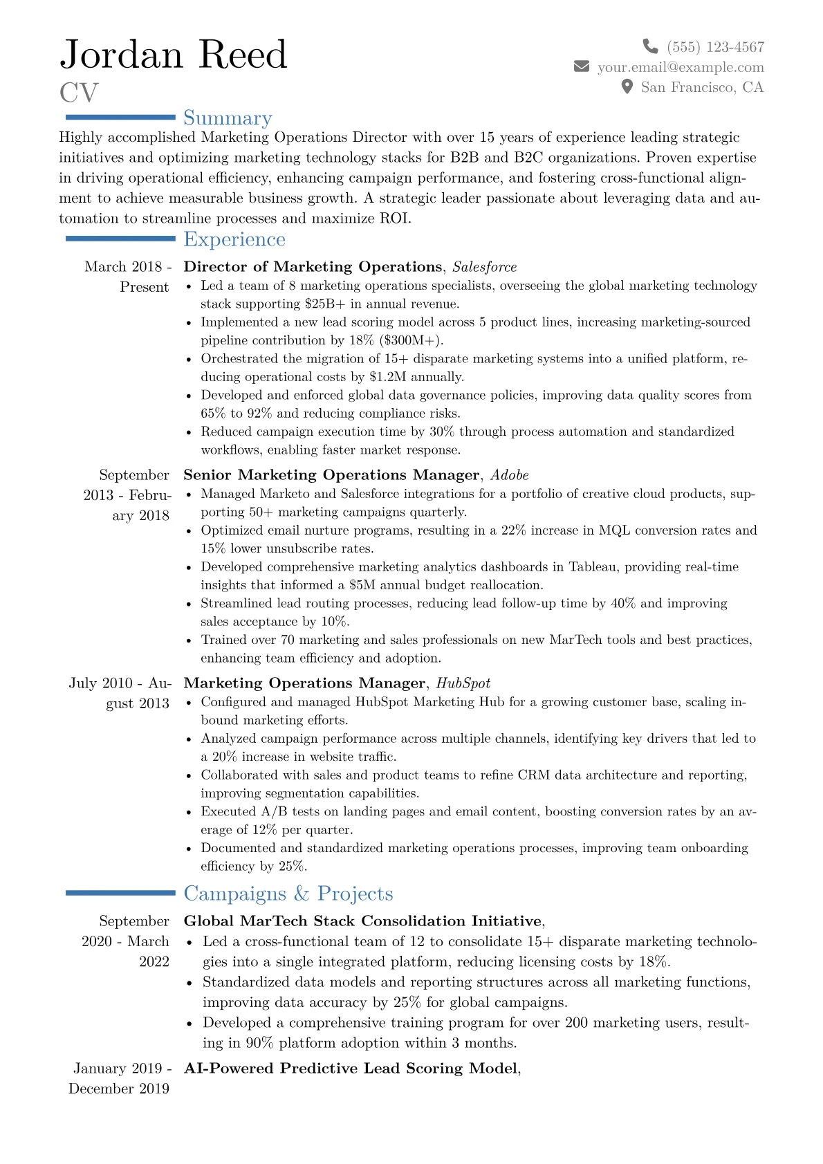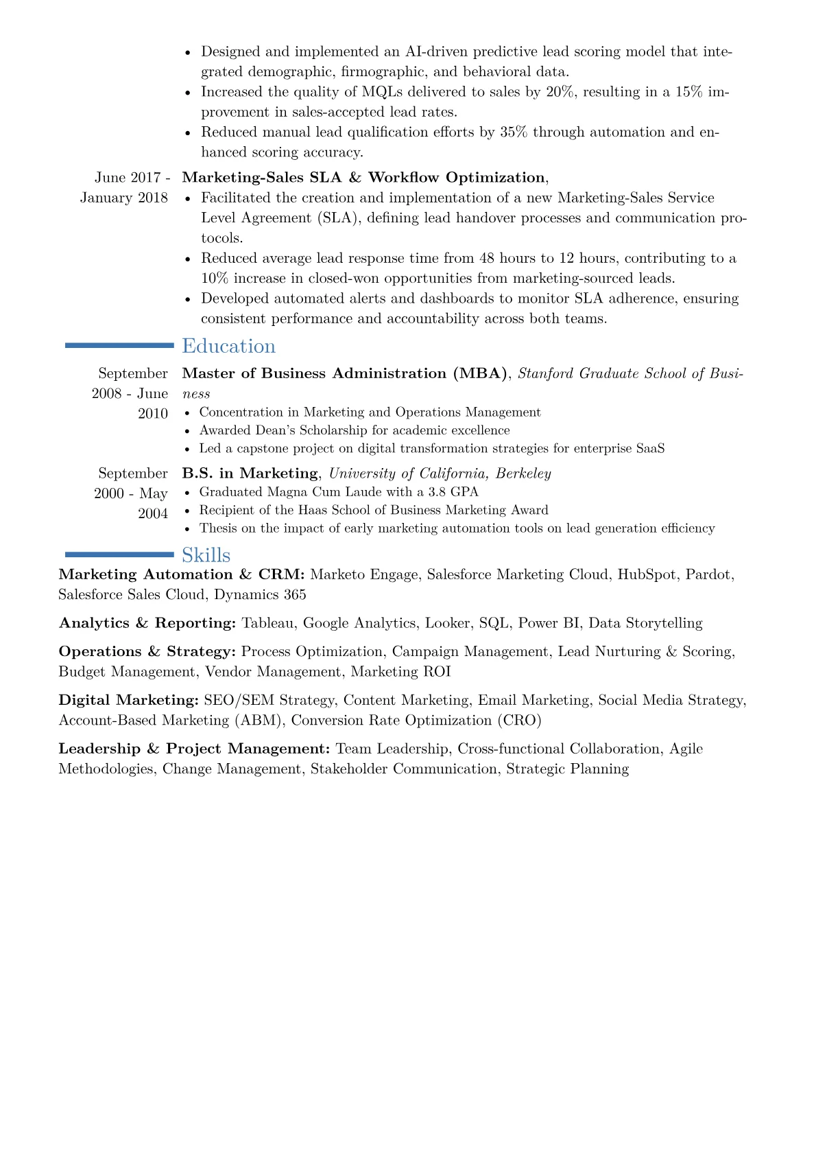 For a Marketing Operations Director in Marketing and Advertising, an impactful resume showcases strategic leadership in optimizing marketing technology and processes. Hiring managers specifically seek evidence of enhanced campaign performance, operational efficiency gains, and measurable contributions to revenue growth. Successful candidates demonstrate expertise in integrating complex MarTech platforms like Salesforce Marketing Cloud or Marketo, implementing robust attribution models, and leading data governance initiatives. Key achievements often include quantified improvements in lead-to-opportunity conversion rates, reductions in campaign execution timelines, or the successful overhaul of an entire marketing operations function.
