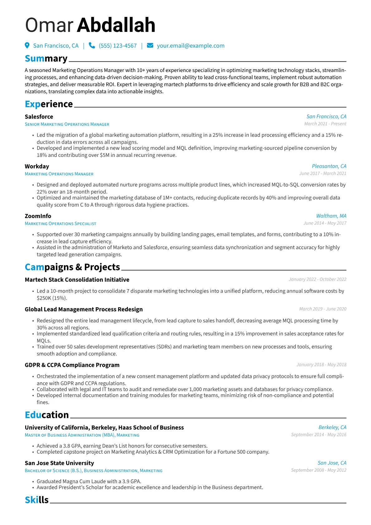 This template was built with JobSprout and can be remixed to create your own tailored Marketing Operations Manager resume, effectively showcasing your unique skills and achievements.