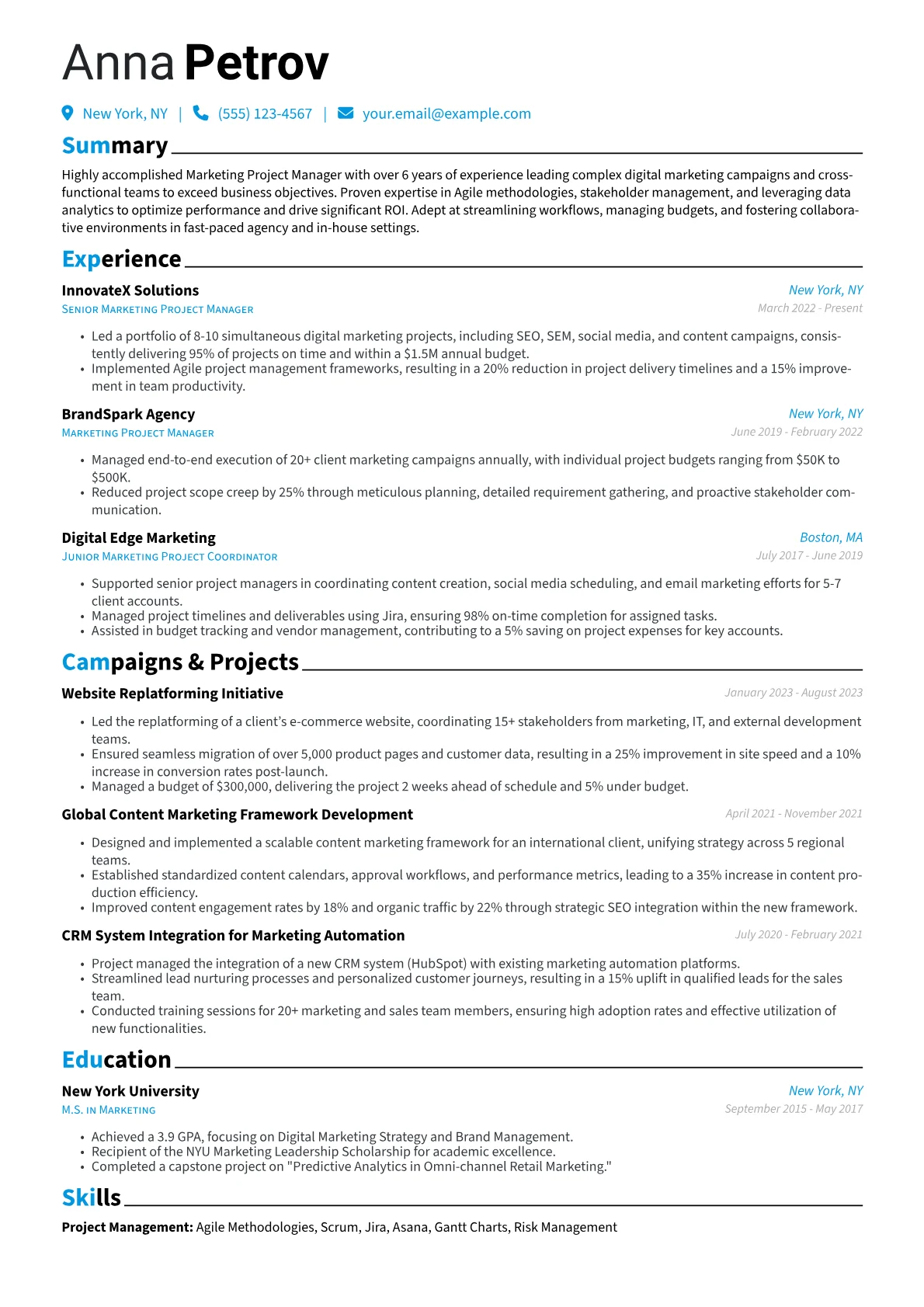 For a Marketing Project Manager in the Advertising and Marketing industry, a strong resume demonstrates clear ownership of campaigns from conception to execution. Hiring managers specifically look for quantified results in areas like lead generation, conversion rates, or audience engagement, often achieved through managing digital campaigns, content initiatives, or product launches. Key terminology such as SEO, SEM, A/B testing, and MarTech stack proficiency should be visible, alongside experience with project management methodologies like Agile or Scrum, and relevant tools like Asana or Jira.
