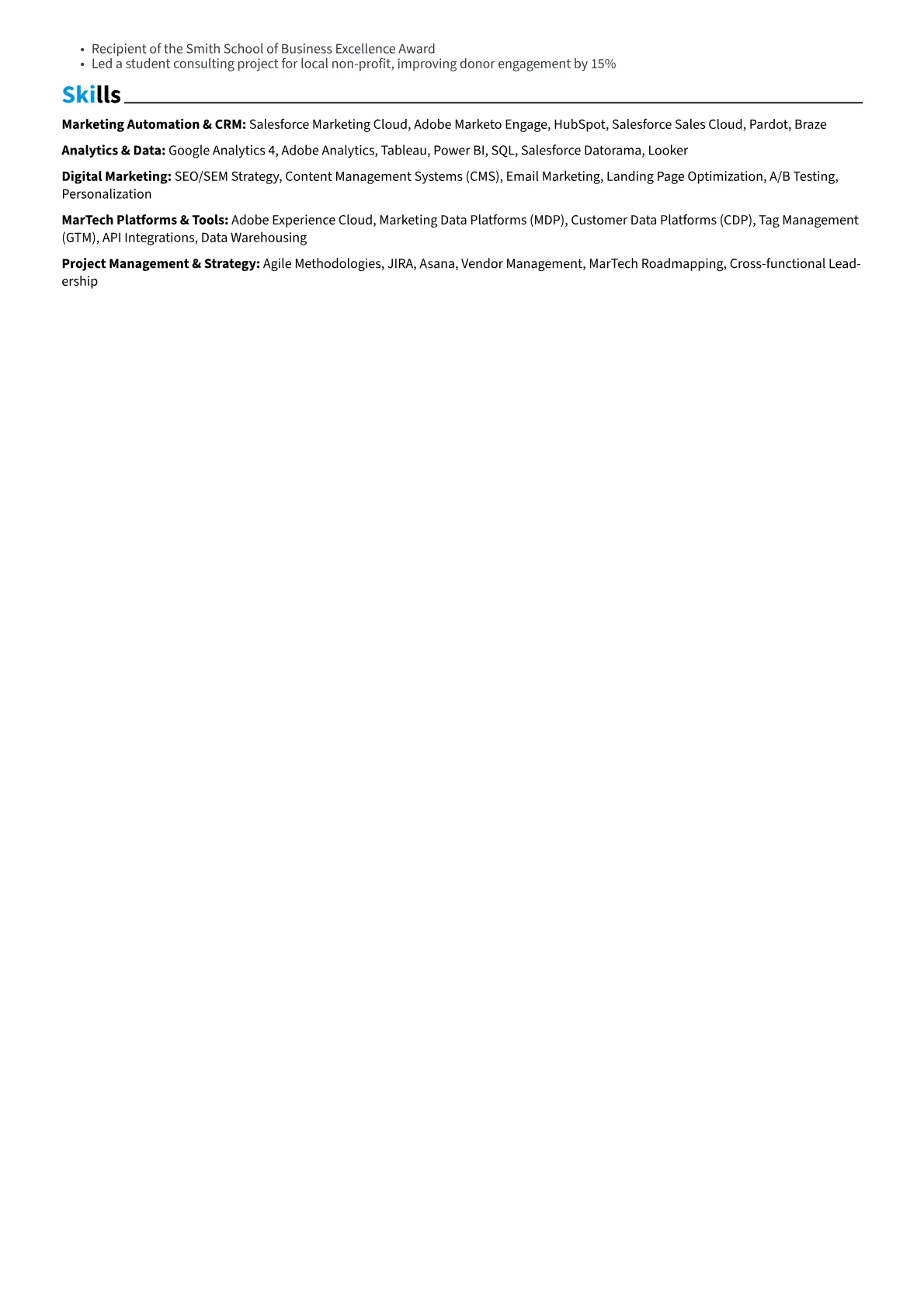 This example CV excels by structuring content to highlight these critical areas. Achievements are consistently quantified, illustrating tangible results like "Increased lead conversion rates by 15% using HubSpot Marketing Hub." Technical proficiencies are logically grouped, distinguishing between "Marketing Automation Platforms," "Data Analytics & BI Tools," and "CRM & CMS Systems." Prominent placement for specific tools such as Google Analytics, Braze, and Optimizely, alongside relevant certifications, immediately conveys the candidate's specialized expertise to a busy recruiter.