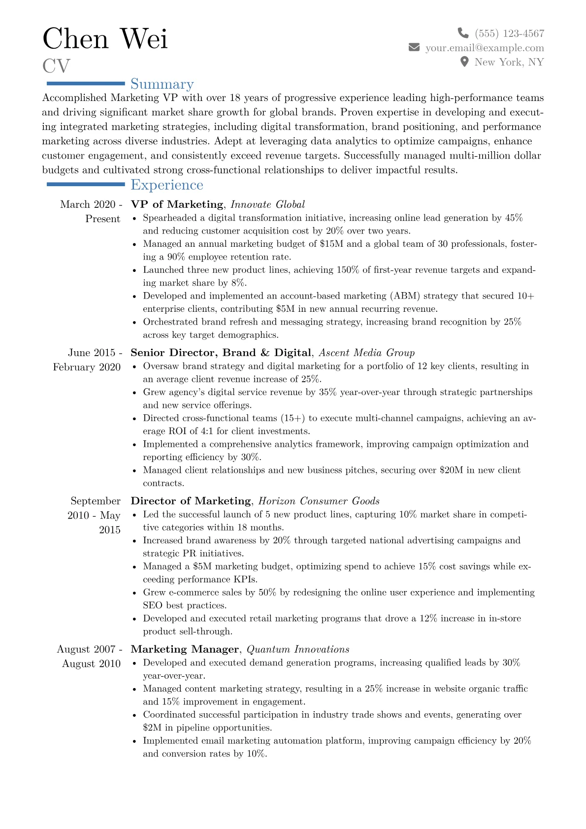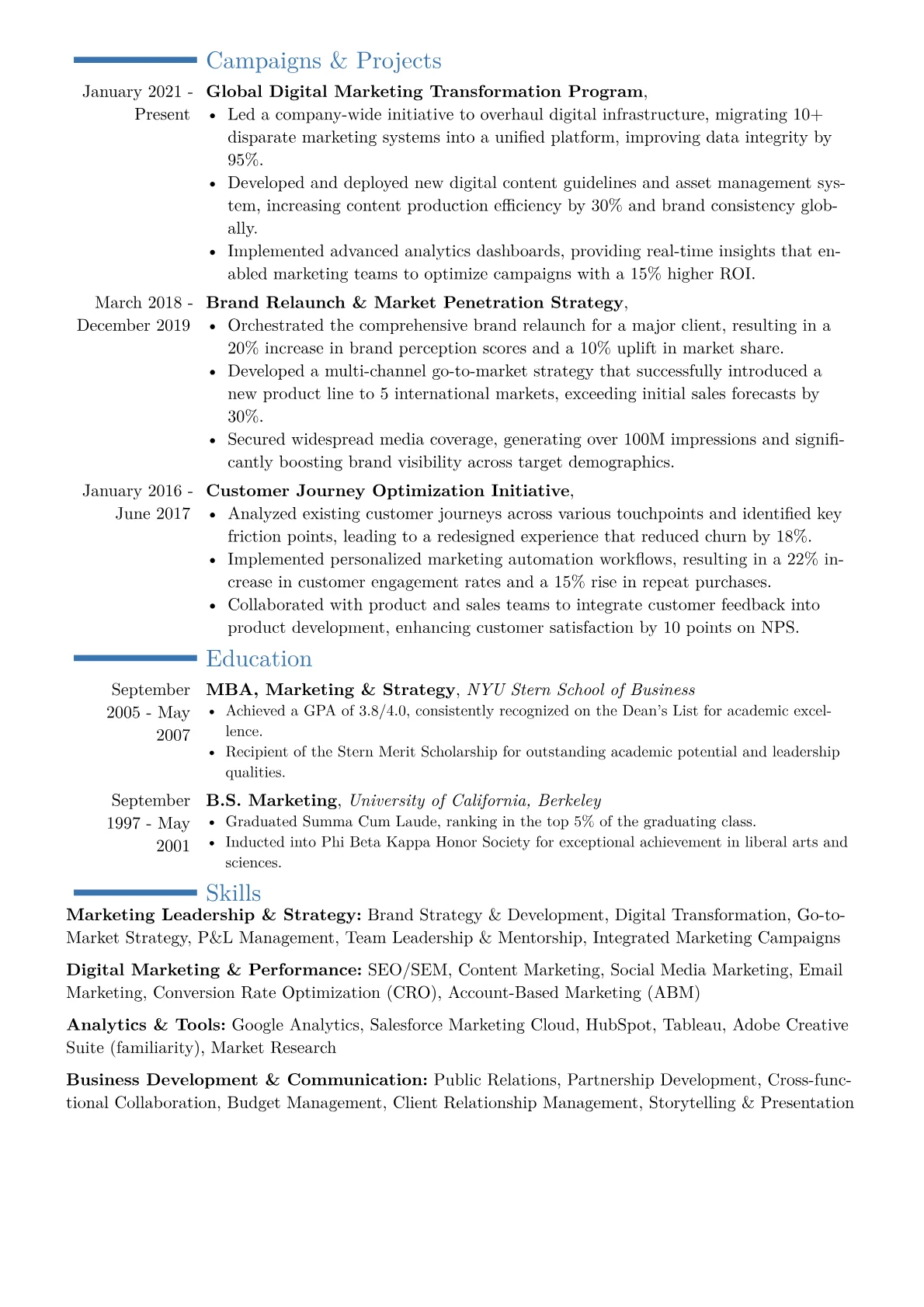 This example resume excels at presenting executive level experience by clearly quantifying achievements. Actions are consistently paired with tangible business results, for instance, "Orchestrated a content strategy that boosted MQLs by 35% year over year." Skills are thoughtfully grouped under categories like Strategic Leadership, Digital Marketing Expertise, and Analytics & Reporting, illustrating both breadth and depth. Key MarTech tools and certifications, such as Salesforce Marketing Cloud, are prominently listed in a dedicated section, immediately communicating technical proficiency and strategic capability.