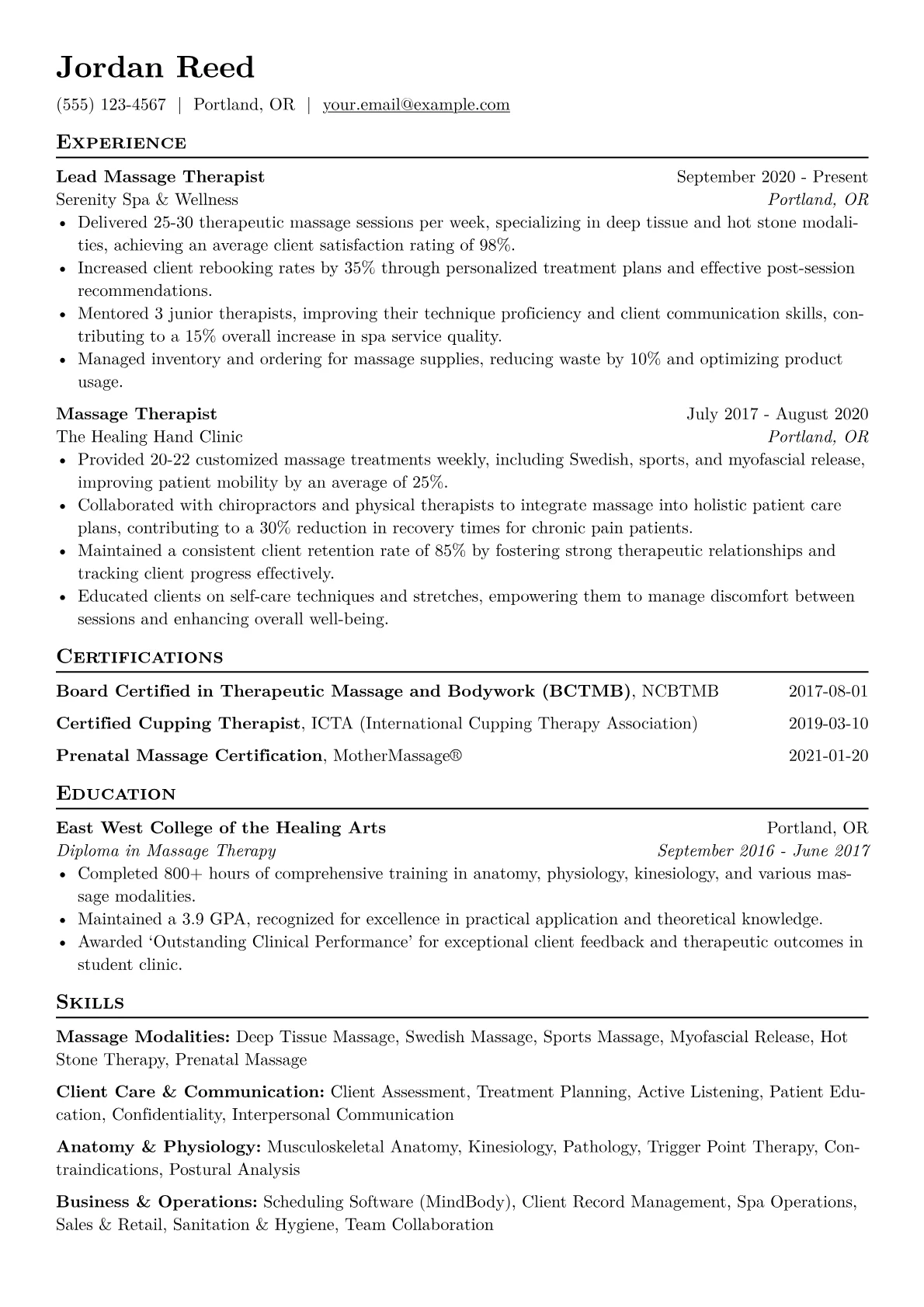 This example CV excels by clearly separating core competencies. Achievements are effectively quantified, showing impact on patient outcomes rather than just listing duties. Skills are thoughtfully grouped into categories like "Clinical Modalities," "Patient Communication," and "Therapeutic Documentation," making it easy for recruiters to identify relevant expertise. Crucially, certifications such as LMT and any advanced modality training are highlighted prominently, alongside proficiency in clinical tools like specific massage tables and patient management software.
