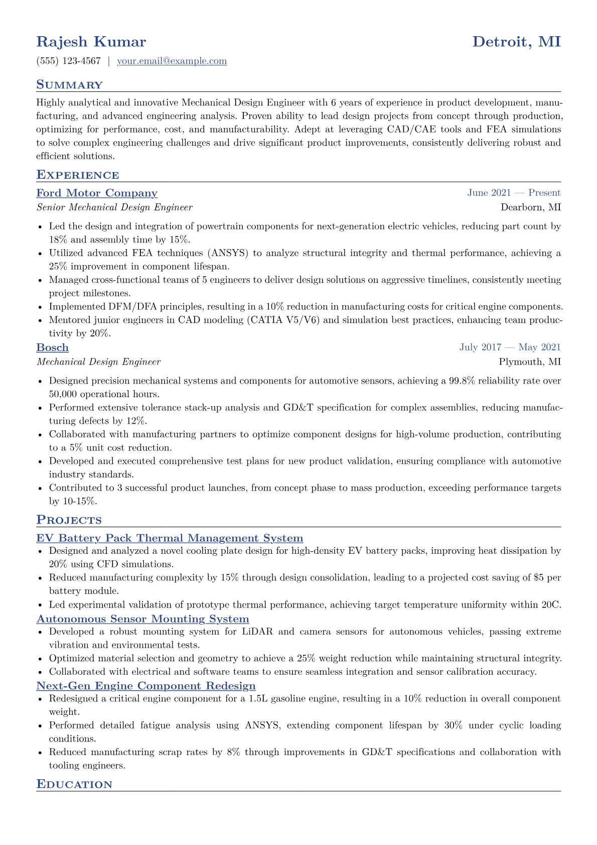 A compelling Mechanical Design Engineer resume in manufacturing demonstrates practical application of design principles to real-world production challenges. Hiring managers specifically look for quantifiable achievements in areas like cost reduction, efficiency improvements, and product reliability. Key terminology includes Design for Manufacturability (DFM), Geometric Dimensioning and Tolerancing (GD&T), and experience with specific material science applications. Highlighting certifications like CSWP and expertise in FEA software such as ANSYS or ABAQUS, alongside a deep understanding of manufacturing processes like injection molding or CNC machining, is crucial.