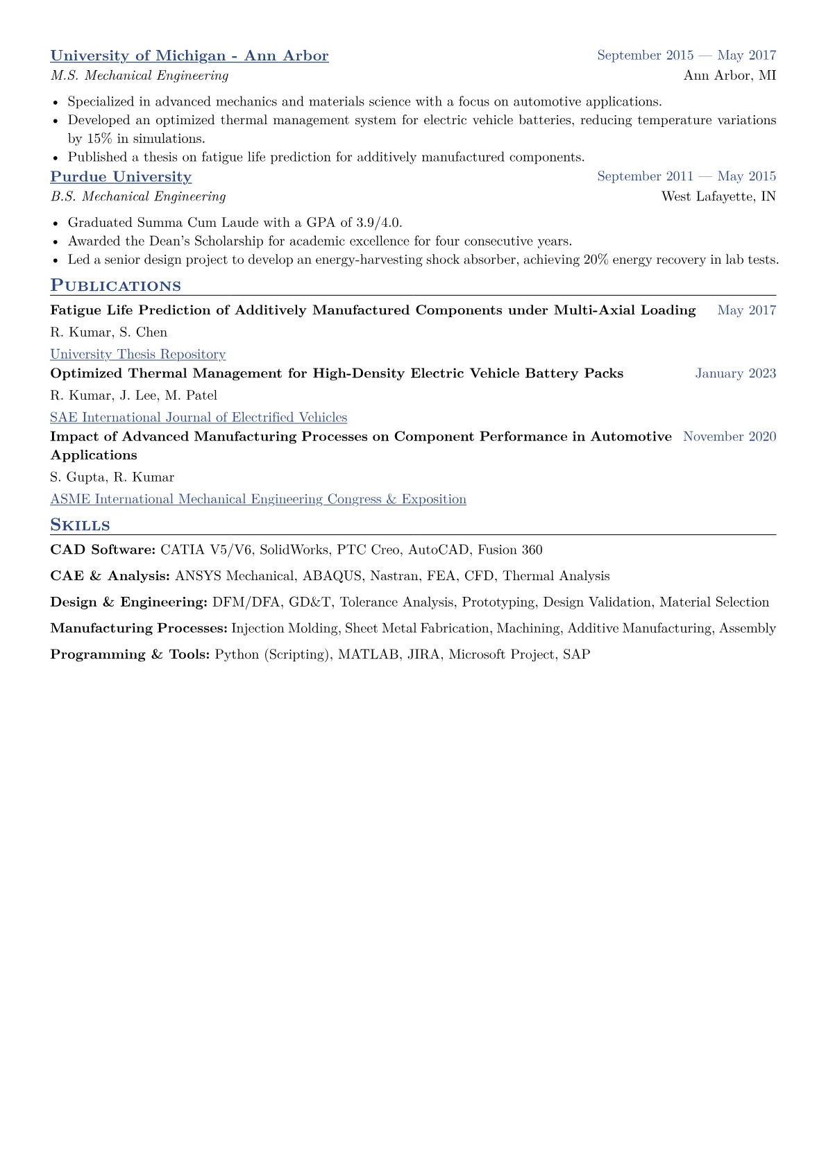This example CV excels by concretely quantifying its achievements, showing impact beyond just tasks performed. For instance, it details how designs reduced material waste by 18% or improved assembly time by 12%. Skills are logically grouped, separating CAD proficiency (SolidWorks, Inventor) from simulation tools and manufacturing process knowledge (DFM, lean principles). The layout prominently highlights relevant certifications and specific industry tools, ensuring a quick scan reveals core competencies and alignment with manufacturing industry standards.