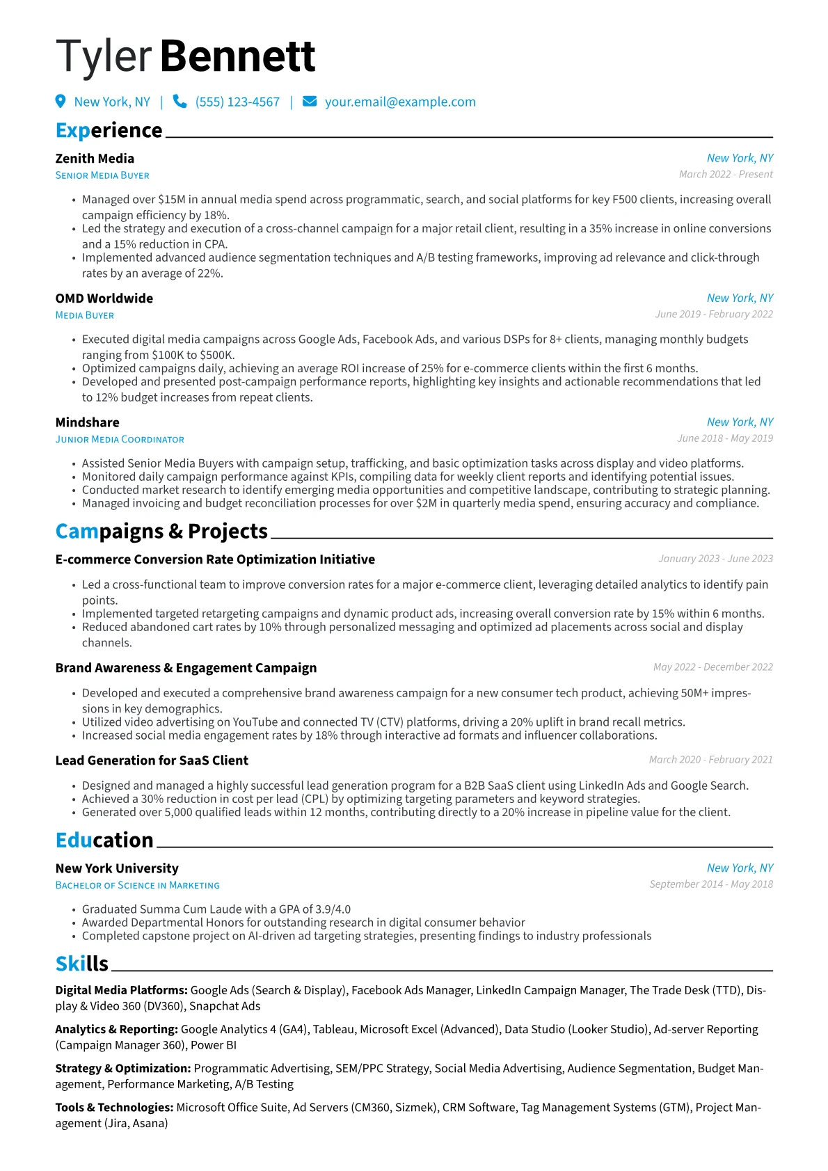 Hiring managers for mid-level Media Buyer roles in Marketing & Advertising prioritize tangible results and proven expertise across diverse ad platforms. A strong resume showcases a candidate's ability to optimize budgets, drive campaign performance, and demonstrate clear ROI, addressing the challenge of quantifying complex strategic decisions. They look for professionals who can articulate their impact on key campaign metrics and overall business objectives.