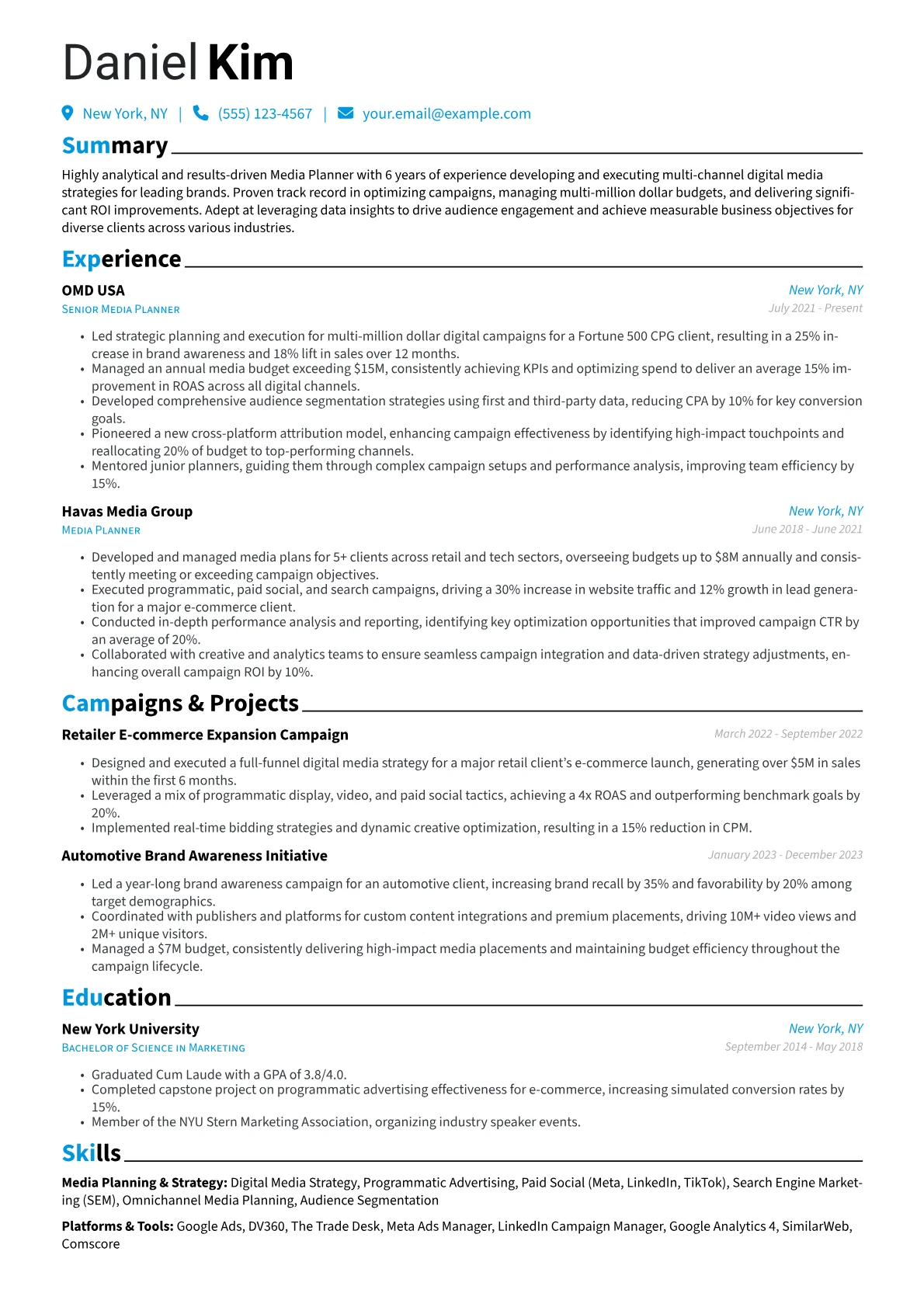 This JobSprout example effectively structures the Media Planner's accomplishments. Each bullet point within experience sections quantifies impact, detailing improvements like "increased ROAS by 20% on a $500k monthly budget" or "optimized campaigns to reduce CPA by 15%." Skills are intelligently grouped, separating "Media Buying Platforms" (e.g., Google Ads, Meta Business Manager, DV360) from "Analytics & Reporting Tools" (e.g., Google Analytics, Looker Studio, SEMrush). Furthermore, key certifications such as Google Ads Search and Meta Blueprint are prominently featured in a dedicated section, immediately signaling core competencies to recruiters.