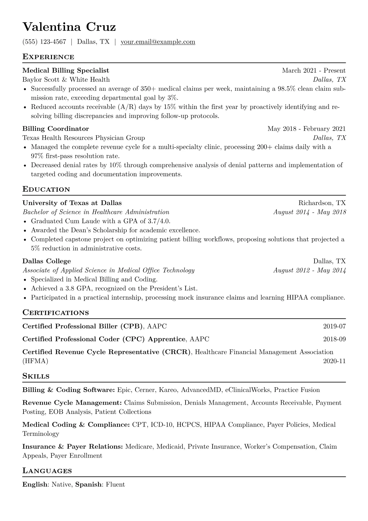 This template was built with JobSprout and can be remixed to create your own tailored Medical Billing Specialist resume. Utilize its framework to highlight your specific achievements and showcase your unique value to healthcare providers.