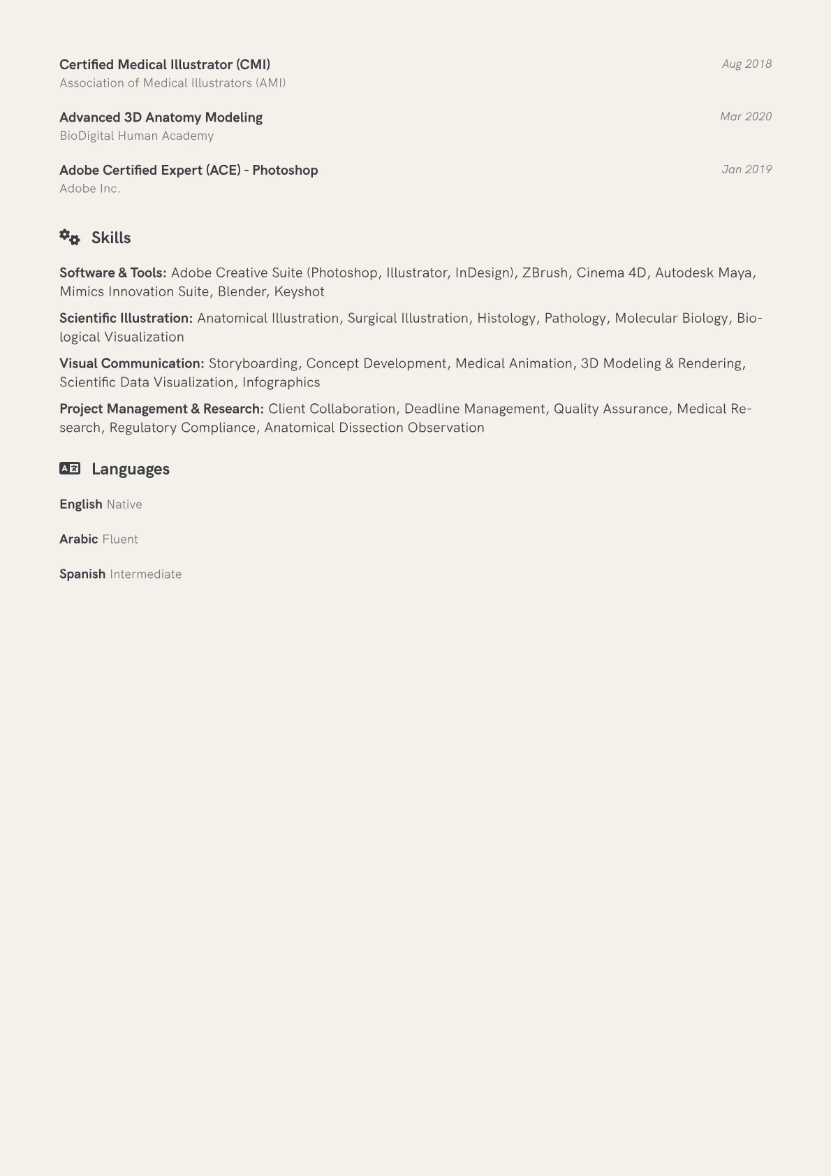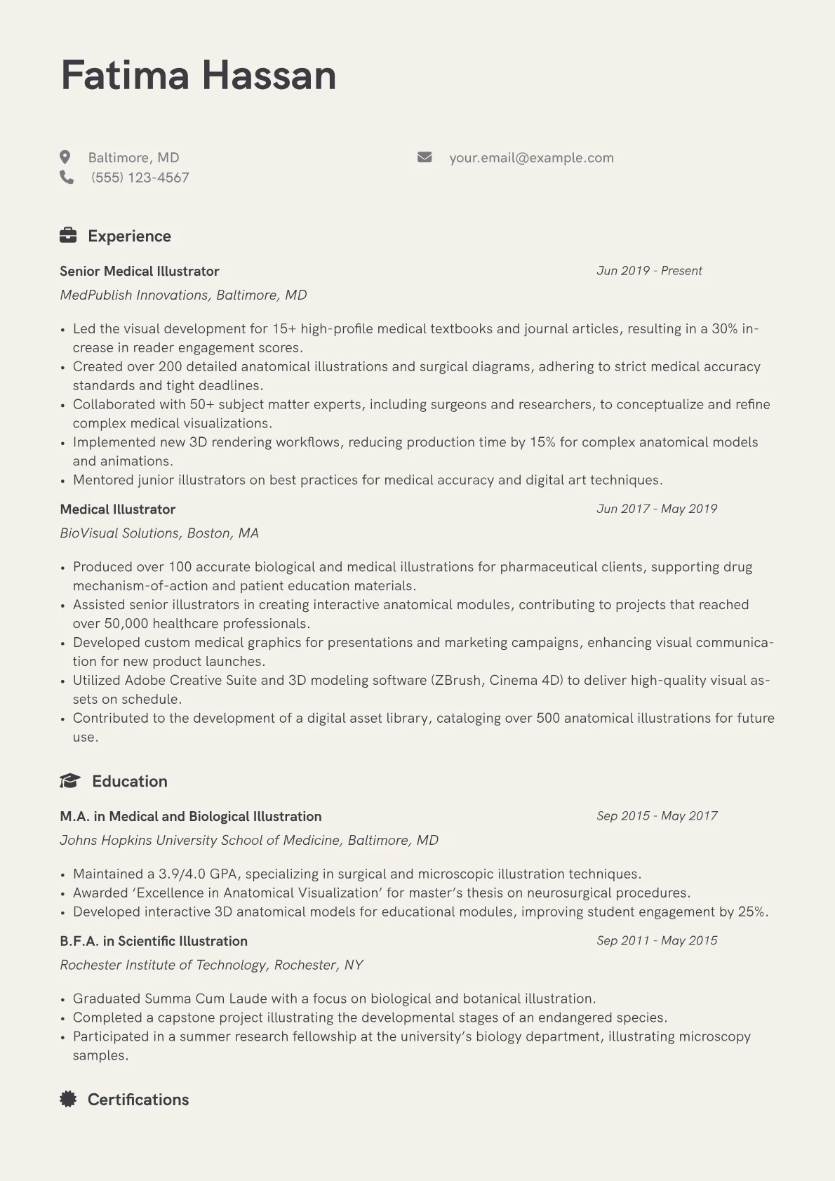 This example effectively highlights a medical illustrator's unique skillset by prominently featuring a portfolio link and grouping specialized skills like 3D modeling, animation, and specific software proficiencies. Quantified achievements, such as designing patient education materials that improved understanding, clearly demonstrate impact. Including relevant certifications or specialized training further reinforces expertise in this niche field.