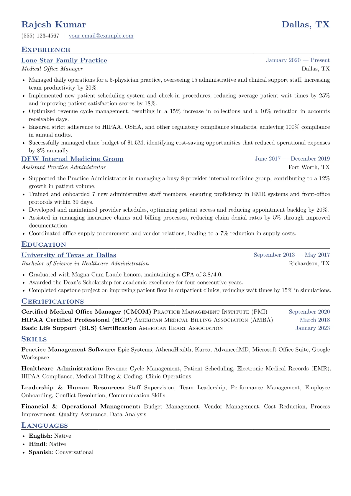 This professional template was expertly built using JobSprout and can be easily remixed to create your own compelling Medical Office Manager resume.