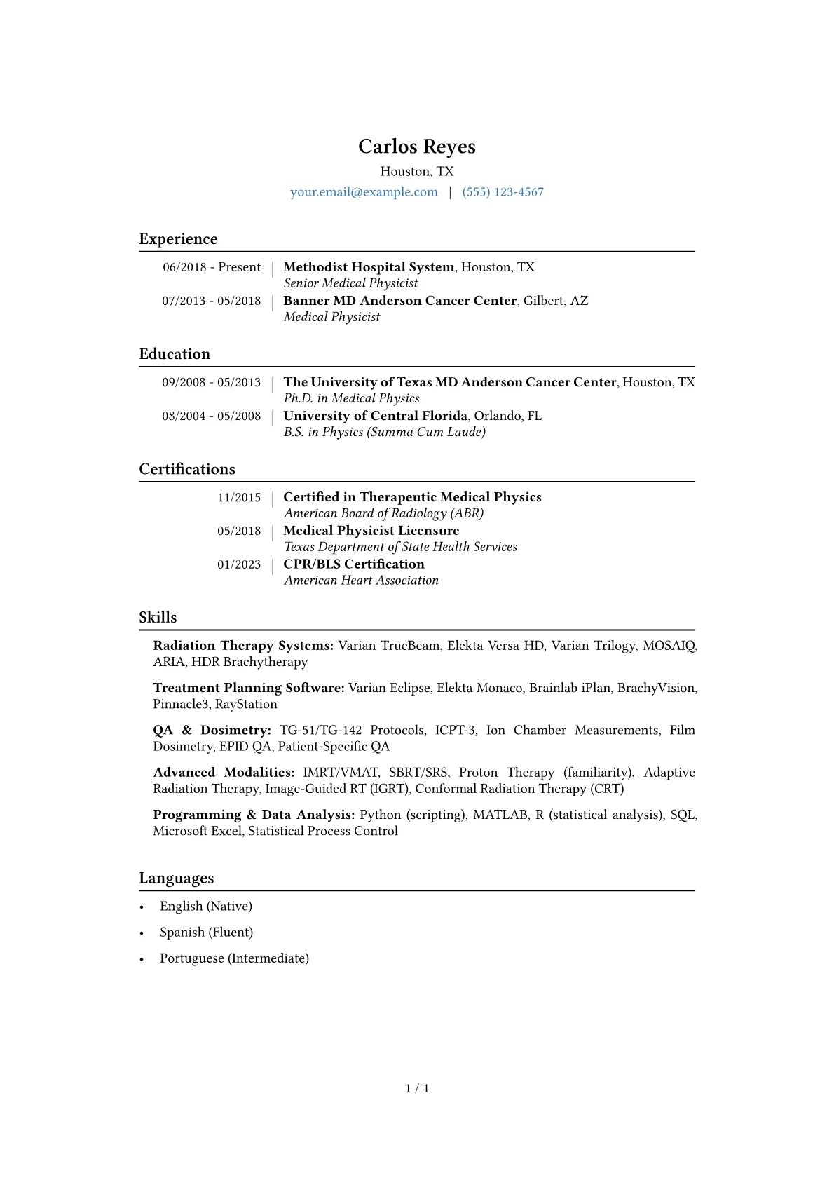 This robust template was built with JobSprout and can be easily remixed to create your own compelling Medical Physicist resume.