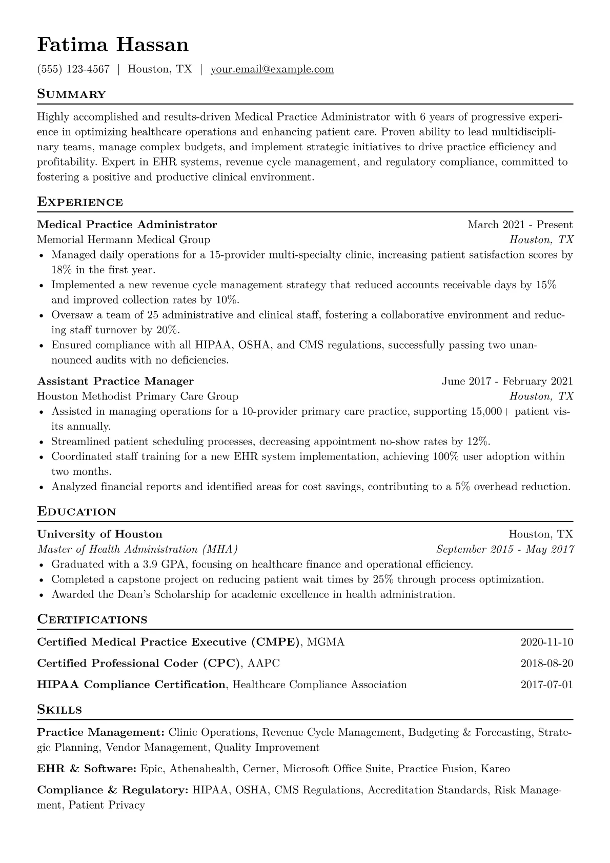This example CV excels by concretely quantifying these achievements, for instance, detailing "oversaw a $2.5 million annual practice budget" or "increased patient satisfaction scores by 10%." Skills are thoughtfully grouped under categories such as "Clinical Operations," "Financial Management," and "Compliance & Quality Improvement," presenting a clear overview of competencies. Crucial certifications and proficiency with specific healthcare IT tools are prominently highlighted, often within a dedicated section or integrated directly into relevant experience descriptions, making a candidate's qualifications immediately apparent.