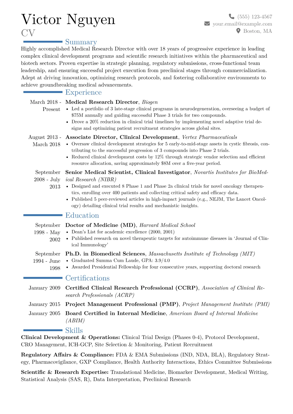 This example resume effectively showcases these elements for a Medical Research Director. Achievements are precisely quantified, detailing project scope or financial impact, such as "oversaw 15 clinical trials, leading to 3 successful IND submissions" or "secured $5M in external research funding." Skills are strategically grouped under headings like "Clinical Development Leadership," "Regulatory Compliance," and "Therapeutic Area Expertise (e.g., Oncology)," emphasizing both strategic oversight and specific technical acumen. Certifications like GCP and proficiency in EDC platforms such as Medidata Rave are prominently highlighted, reinforcing specialized qualifications.
