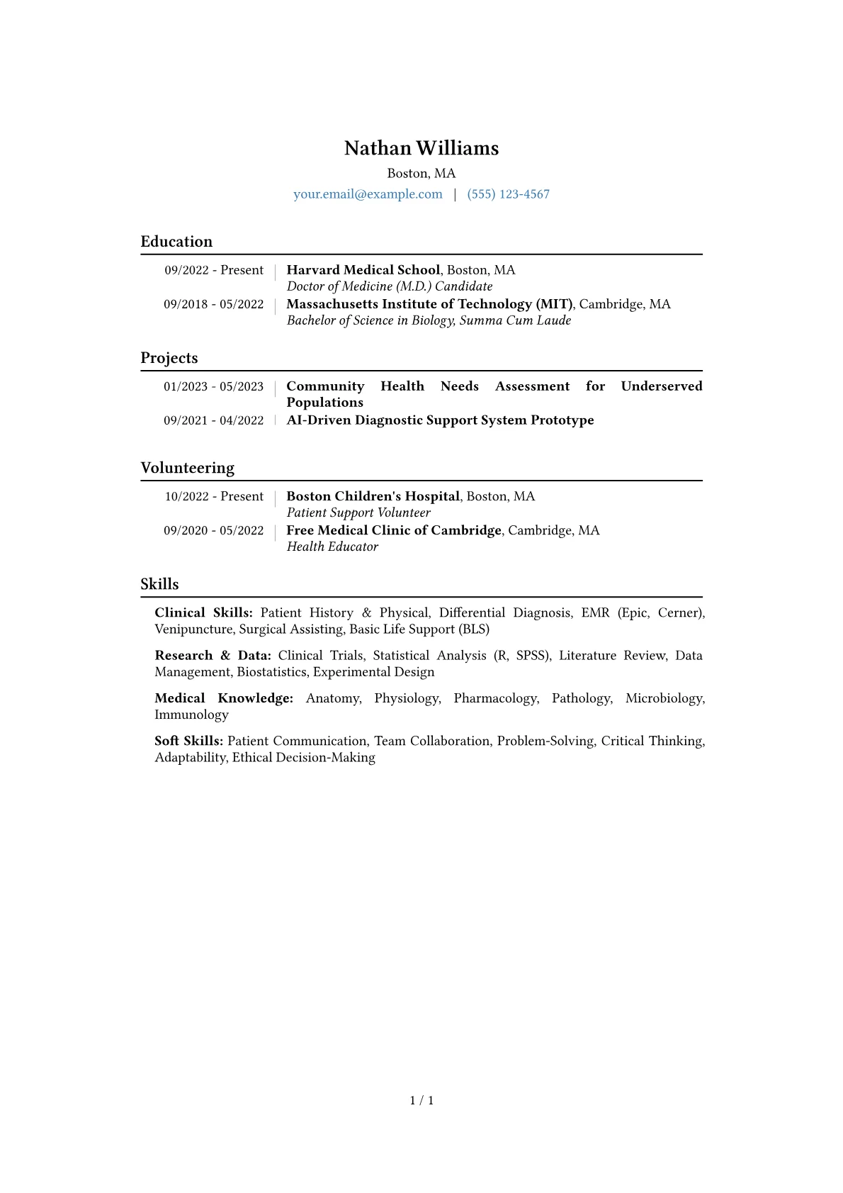 This effective template was expertly built using JobSprout and can be easily remixed to personalize and create your own standout medical student resume.