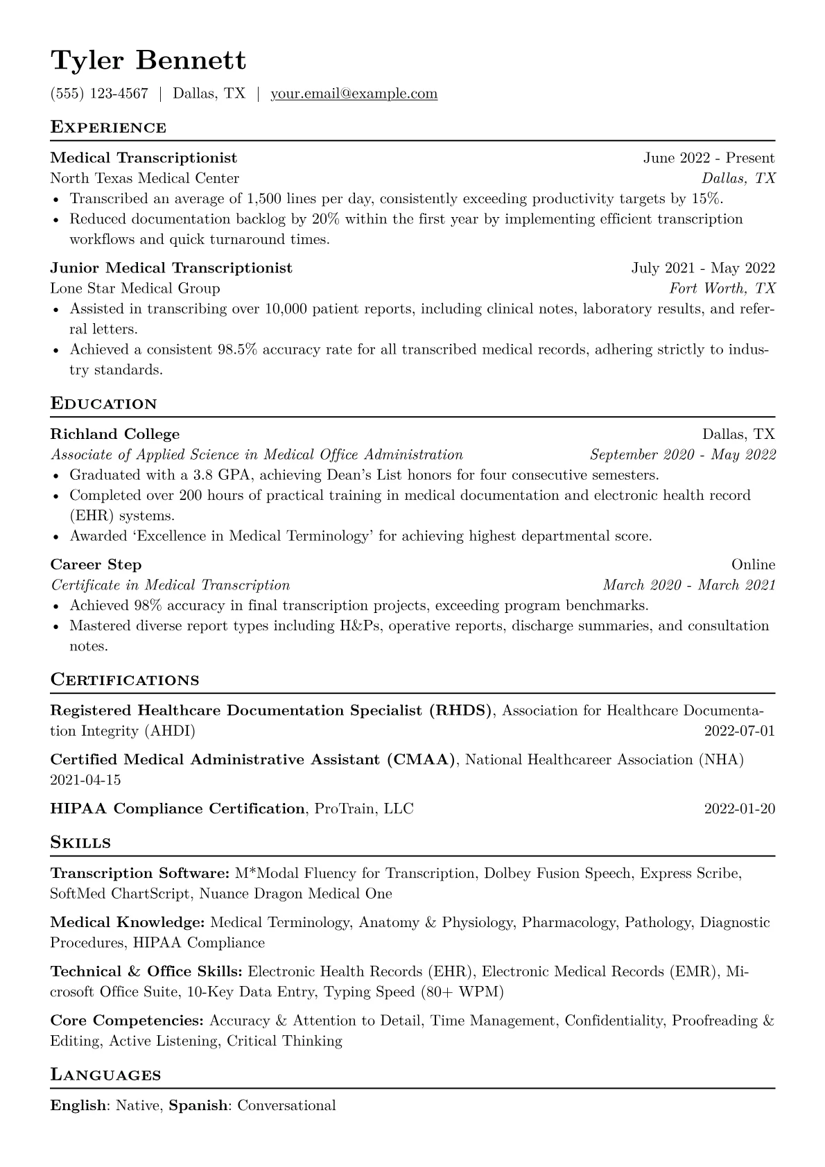 This professional template was built with JobSprout's builder and can be easily customized to create your own compelling Medical Transcriptionist resume.
