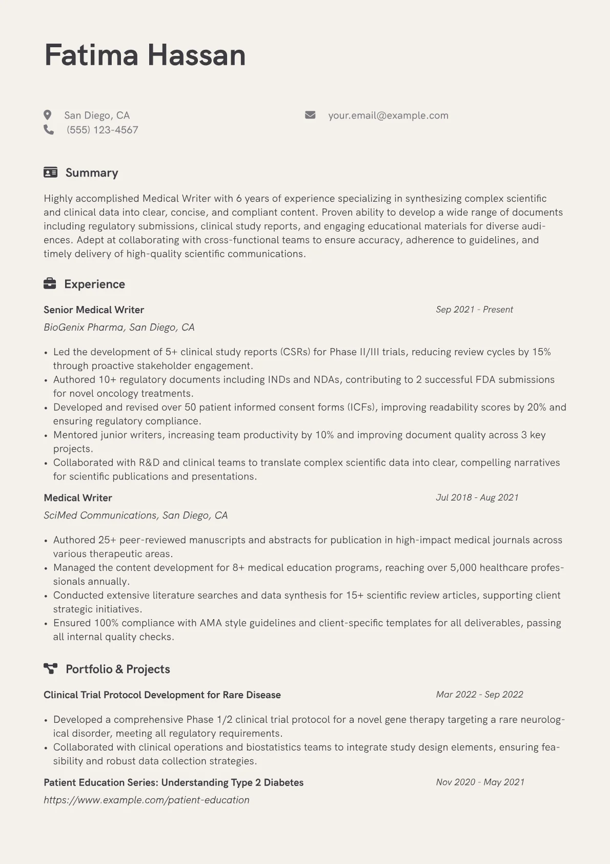 This template was built with JobSprout and can be remixed to create your own tailored Medical Writer resume. Optimize your job search by leveraging its customizable features.