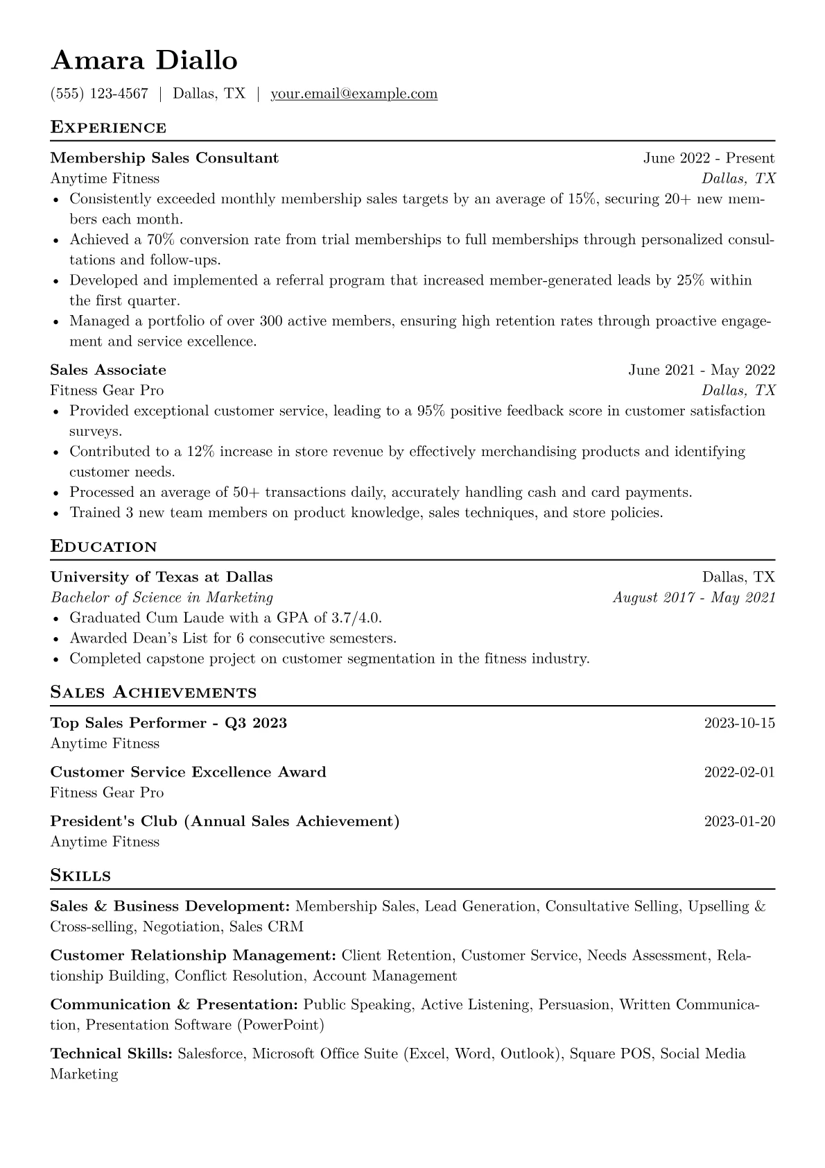 Crafting a compelling Membership Sales Consultant resume requires showcasing a blend of sales acumen, exceptional customer service, and strong communication skills. Hiring managers in diverse "Other" industries, from fitness clubs to professional associations, seek candidates who can not only meet sales targets but also build lasting relationships and effectively articulate value. The unique challenge lies in transforming prospects into loyal members, often necessitating empathy and persuasive presentation abilities.