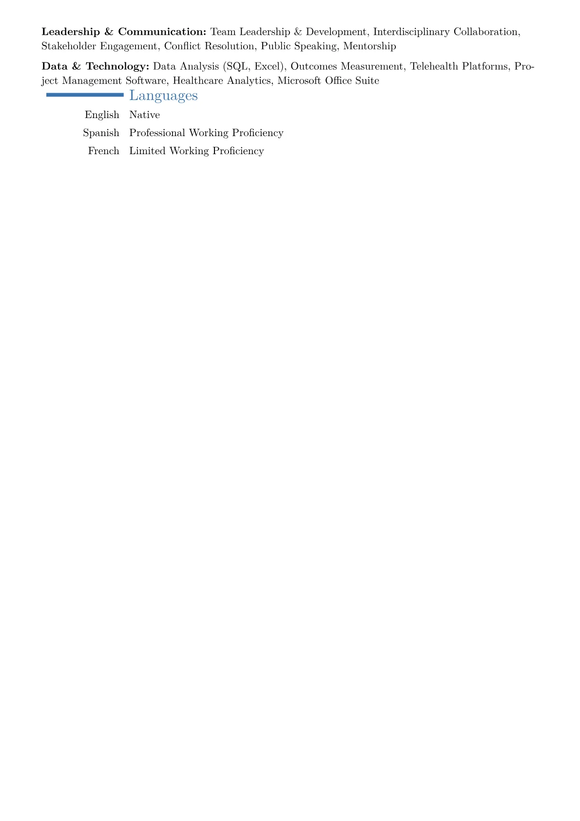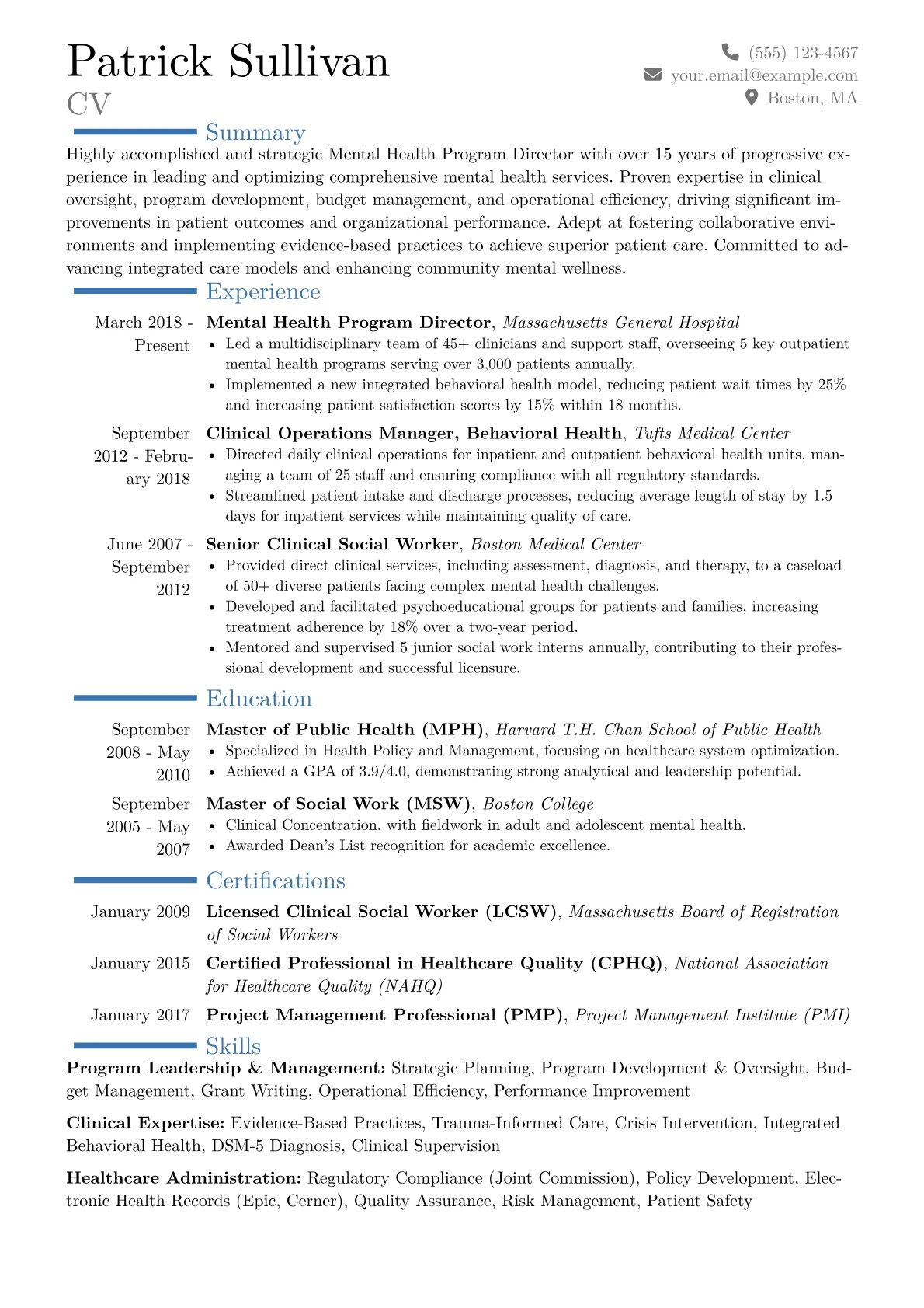 This example CV effectively highlights a Mental Health Program Director's executive-level contributions. Achievements are quantified, illustrating growth such as "increased patient access by 30%" or "managed an annual budget of $X million," providing clear indicators of scale and success. Clinical, operational, and leadership skills are well-grouped, making the candidate's core competencies immediately apparent. Crucially, the resume integrates industry-specific terminology like "integrated behavioral health models," "telehealth expansion," and "trauma-informed care," demonstrating deep expertise.