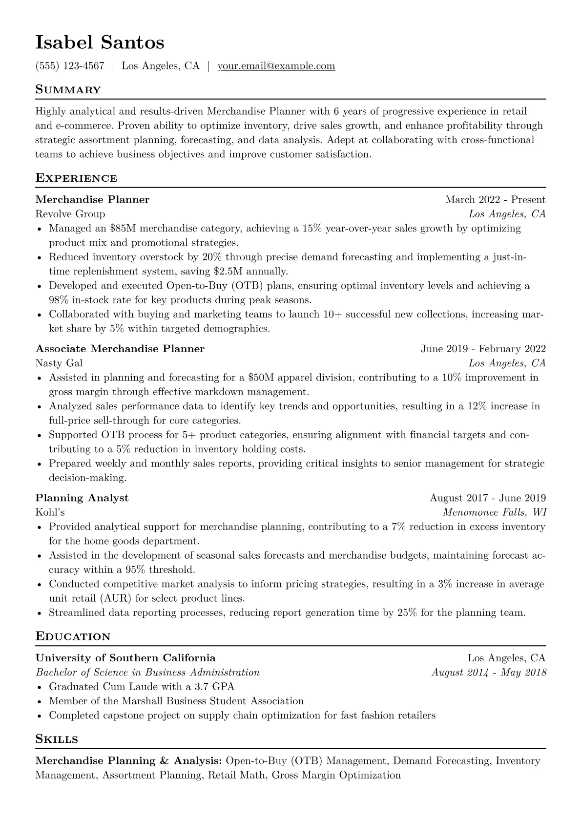 For a mid-level Merchandise Planner in Retail & E-commerce, hiring managers prioritize demonstrated impact on profitability and inventory health. Achievements should quantify improvements in gross margin return on investment GMROI, sell-through rates, and open to buy OTB management. Critical skills include precise sales forecasting, inventory optimization, and vendor collaboration. Using terminology like replenishment strategies, markdown optimization, and promotional planning is key. Proficiency with ERP systems such as SAP or merchandising platforms like Blue Yonder is also highly valued.