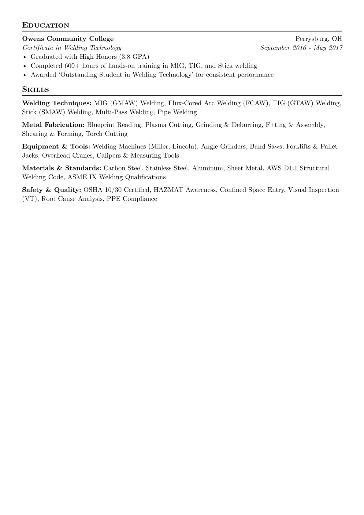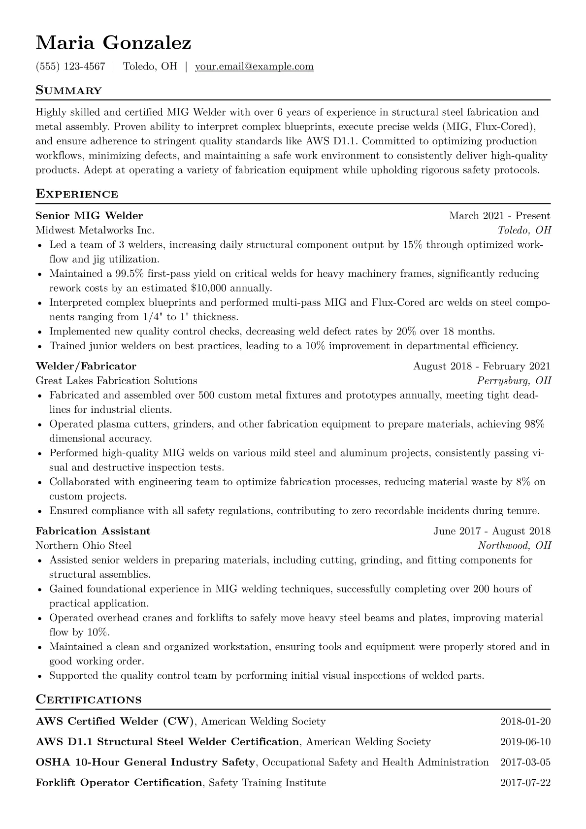 This example CV effectively highlights a MIG Welder's critical qualifications. It groups technical proficiencies like specific welding processes and equipment operation (Miller, Lincoln Electric welders) distinctly from safety and quality assurance protocols. Achievements are impactfully quantified, showcasing reduced defect rates or increased production output per shift. A dedicated section clearly lists pertinent certifications such as AWS D1.1, reassuring employers of immediate compliance and capability.