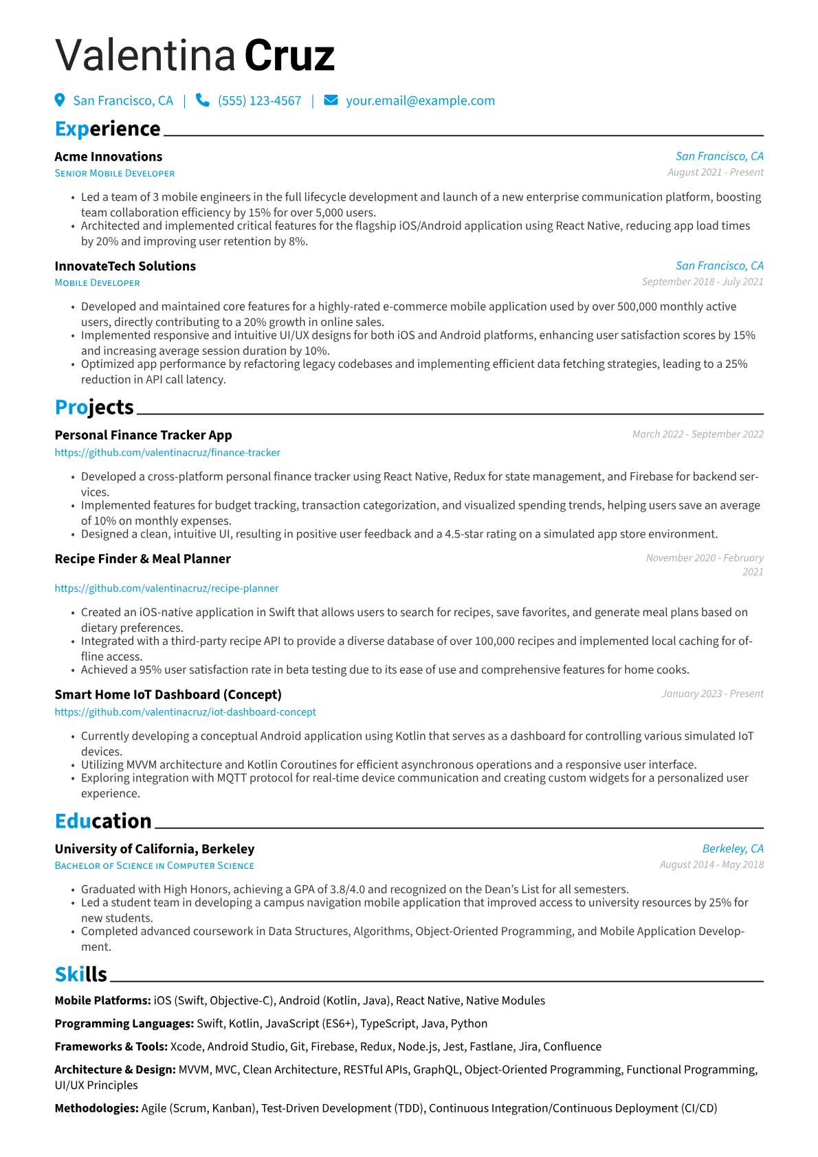 This example excels by quantifying achievements, such as specific app download numbers or performance improvements, which are critical for mid-level roles. Its clear skills grouping, separating iOS, Android, and cross-platform technologies, allows recruiters to quickly assess relevant competencies. The inclusion of relevant certifications further validates specialized mobile development expertise.
