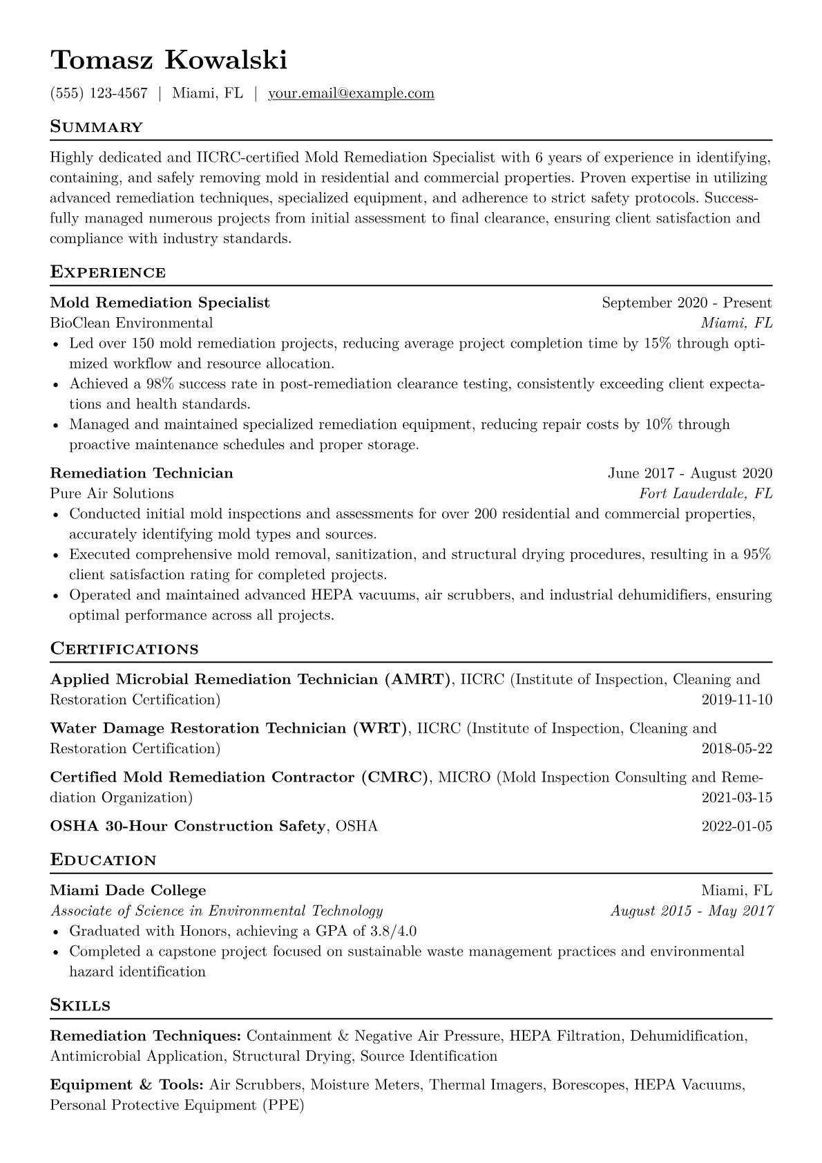 This template was built with JobSprout and can be remixed to create your own tailored Mold Remediation Specialist resume. Utilize its structure to emphasize your unique contributions to manufacturing safety and operational efficiency.