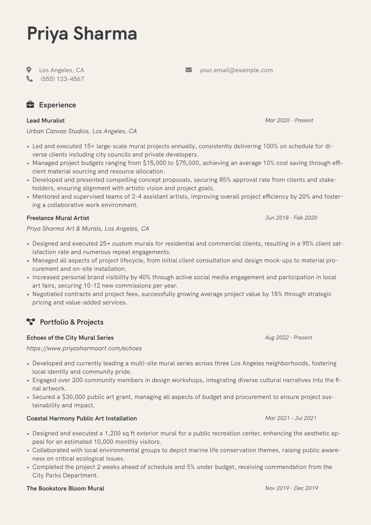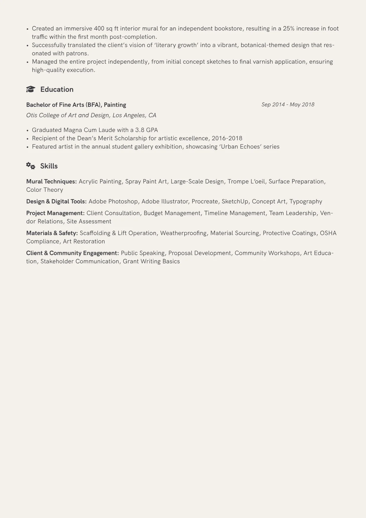 This example excels by prioritizing quantified achievements, such as "completed X murals covering Y square feet" or "managed Z-person teams." Its intelligent skills grouping separates artistic techniques from project management and client communication abilities, offering a comprehensive view. Including relevant certifications further underscores a professional commitment to safety and specialized techniques.
