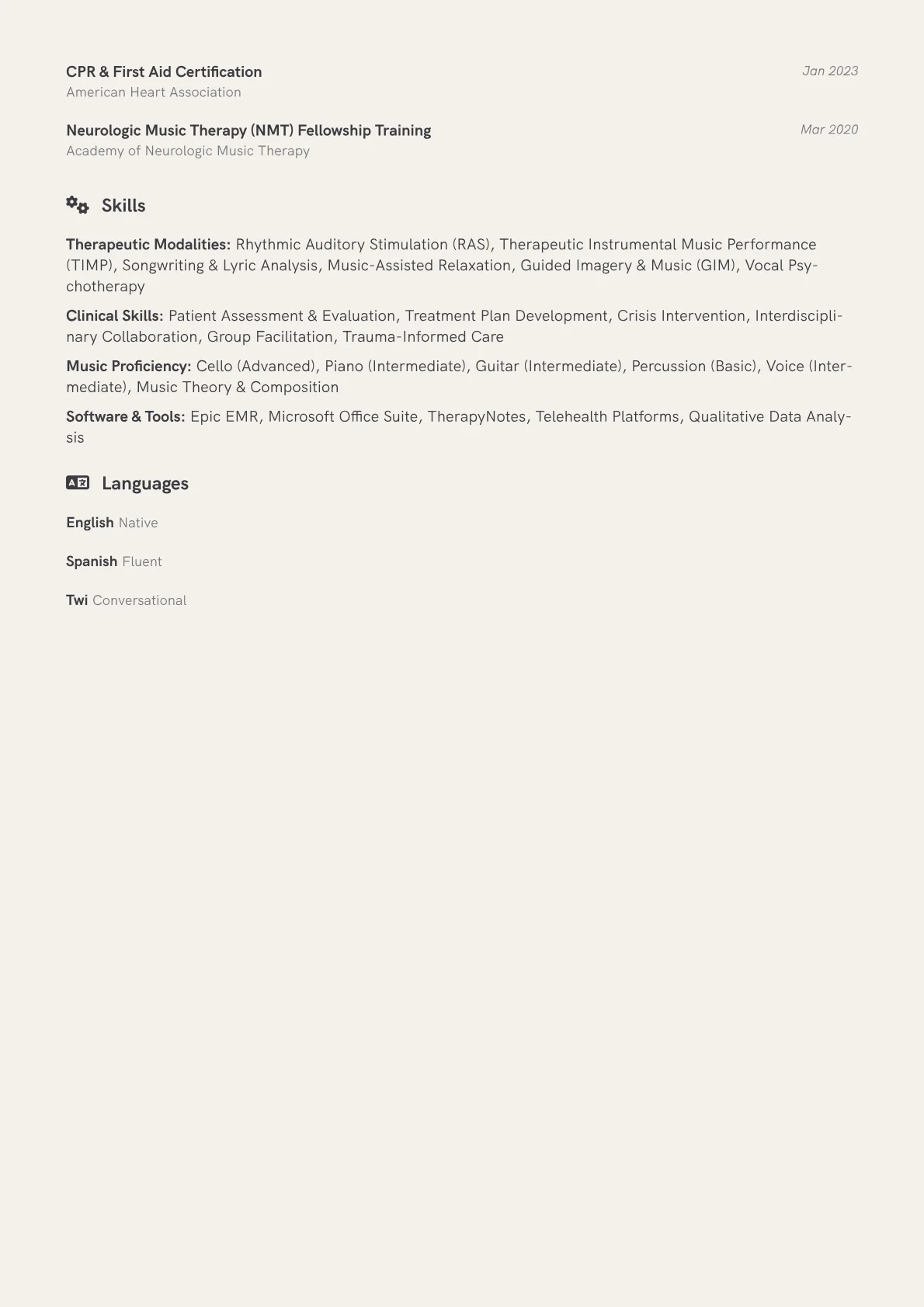 This example excels by strategically highlighting quantifiable achievements, such as specific caseload numbers or measurable patient progress, which translate qualitative work into tangible outcomes. Clear presentation of relevant certifications like MT-BC, alongside dedicated skills grouping for clinical techniques and EMR proficiency, immediately communicates readiness for healthcare settings.